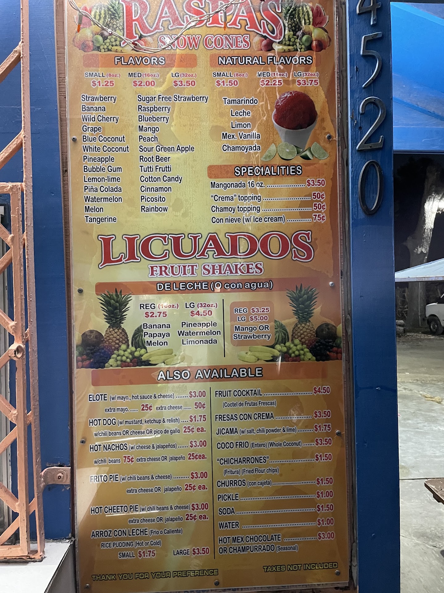 Read more👍 This is a fantastic snow cone stand located in North Houston, relatively close to the Heights and not too far from Downtown. 👍 They serve the best elote I've had in Houston. Unlike the "lazy elote" that some restaurants serve (which is just corn on the cob with a bit of mayo and spice), their elote features kernel corn topped with generous mayo, cheese, and spice. 👍 The Cheeto-pie is a refreshing twist on the classic Frito pie. 👍 Their snow cones are excellent, too. You can even ask for a cream topping. I initially thought it sounded unappealing, but it pairs surprisingly well with certain flavors, like root beer. 👎 The only downside is that the establishment offers only outdoor seating. This can be uncomfortable for customers who don’t want to risk making a mess in their car. 🤜 Foreign Language: Most employees are native Spanish speakers, which can sometimes make placing an order challenging. However, there is usually someone available who can take your...