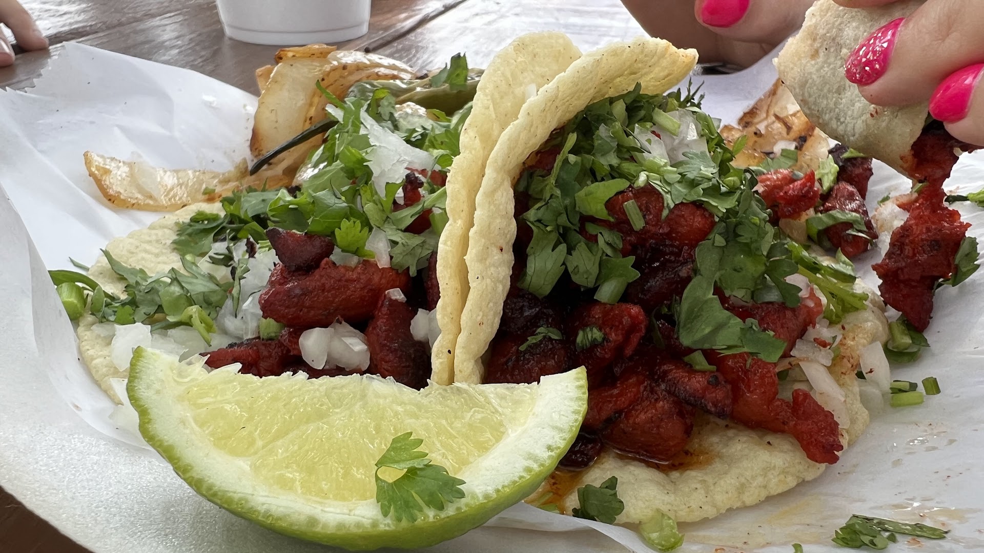 The ladies that took my order were so sweet. Pastor tacos, fire. Fajita torta, fire. Aguas frescas de sandia y mango, complete fire. Pupusas, fire. The salsas were both actually fire, so proceed with caution.
