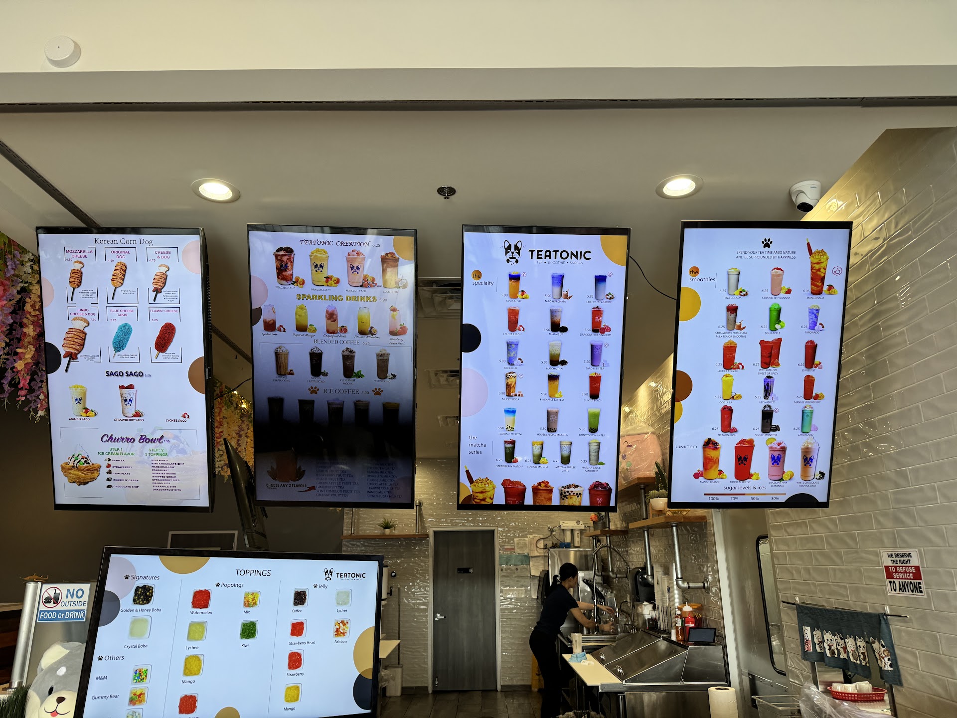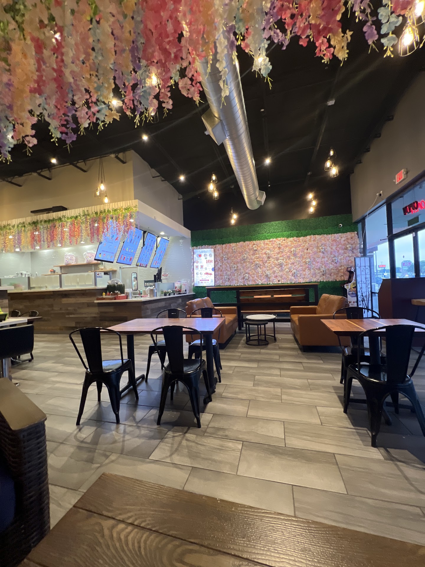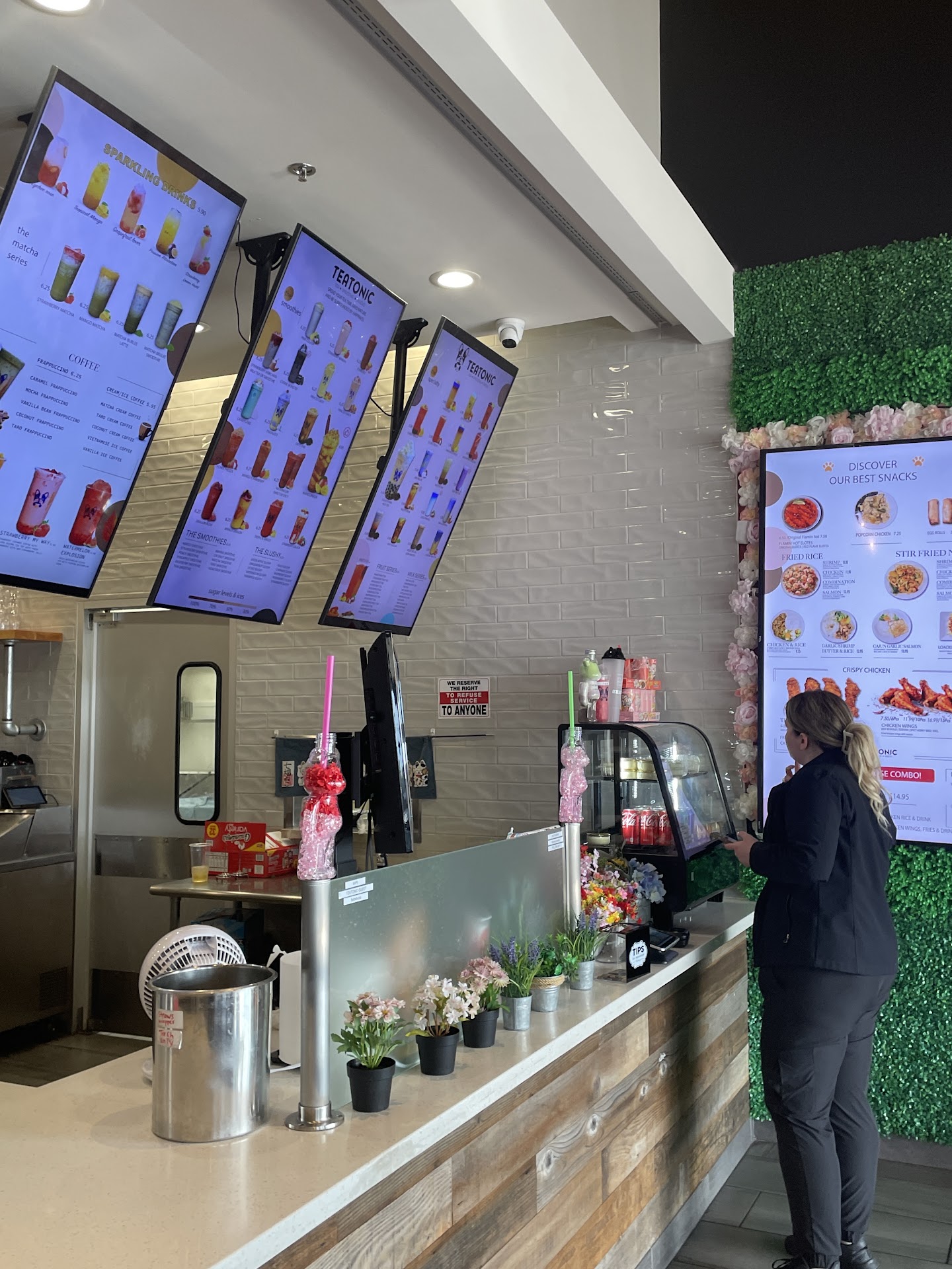 Atmosphere: Teatonic offers a vibrant and inviting atmosphere perfect for a casual hangout or a quick refreshment stop. The decor is modern with a playful touch, featuring a charming floral wall and comfortable seating. The colorful digital menus are easy to read and visually appealing, adding to the overall pleasant experience.