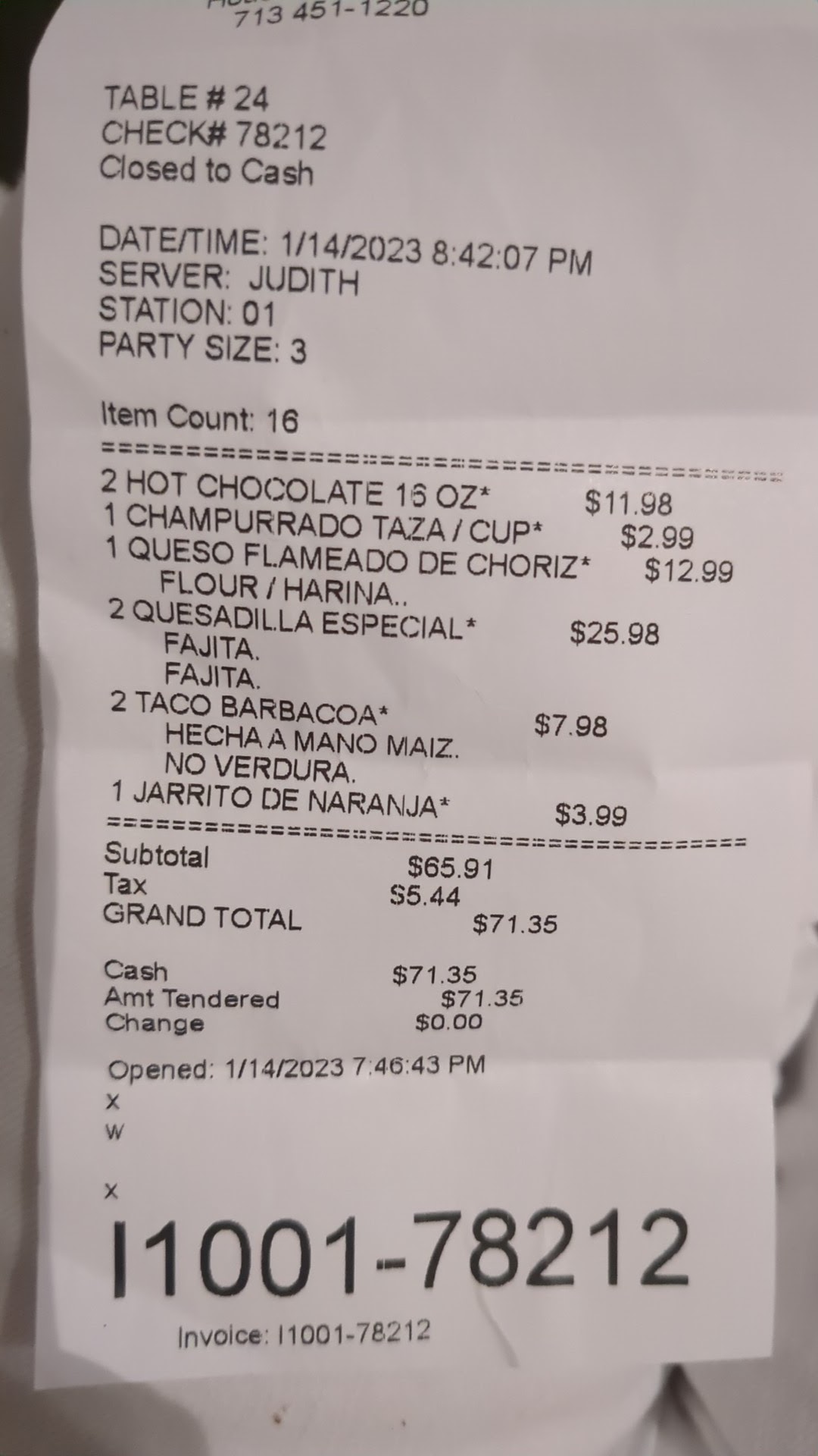 Read moreSave your money, because this place is not it. We had issues from the start. Tried to order unsweetened teas, supposedly the machine wasn't working, but half way into the time there, heard her way she would get them unsweetened teas, never thought to tell us, who initially wanted it, had to ask her.. The waitress wasn't attentive at all, no refills, we initially ordered 4 fajita taco salads, it was nothing but fatty pieces and some hard pieces as well, so we ended up trading it for ground beef, and it was totally drenched in water. I asked our server if they drained the meat, she said "Yea but you know, sometimes the meat from the water gets in" on top of this, they brought 3 out of 4 without the sour cream and gauc, when she brought it back out, there was no lettuce. I mean, wow. Long story short, I asked if she'd comp the taco salads, just the 3 that were problematic but no. Instead, I end up arguing with the waitress and the so called manager. Full on arguing. I mean, the sad part is, there was a language barrier, so the waitress never expressed to the manager all the issues we had prior, just that I wanted taco salads compted. Making it seem like I am looking for hand outs and being unreasonable. I made sure I told her she did NOT come check on us. She disappeared. 4 other severs asked me what I needed, seeing as though I was continously trying to find our sever. The waitresses excuse for not getting refills, or checking on us, was that she had other tables. I should of just left, honestly. This experience was so horrible and the food was not good. The only thing they really have going for them is a diet coke, and their chorizo queso. Save your time...