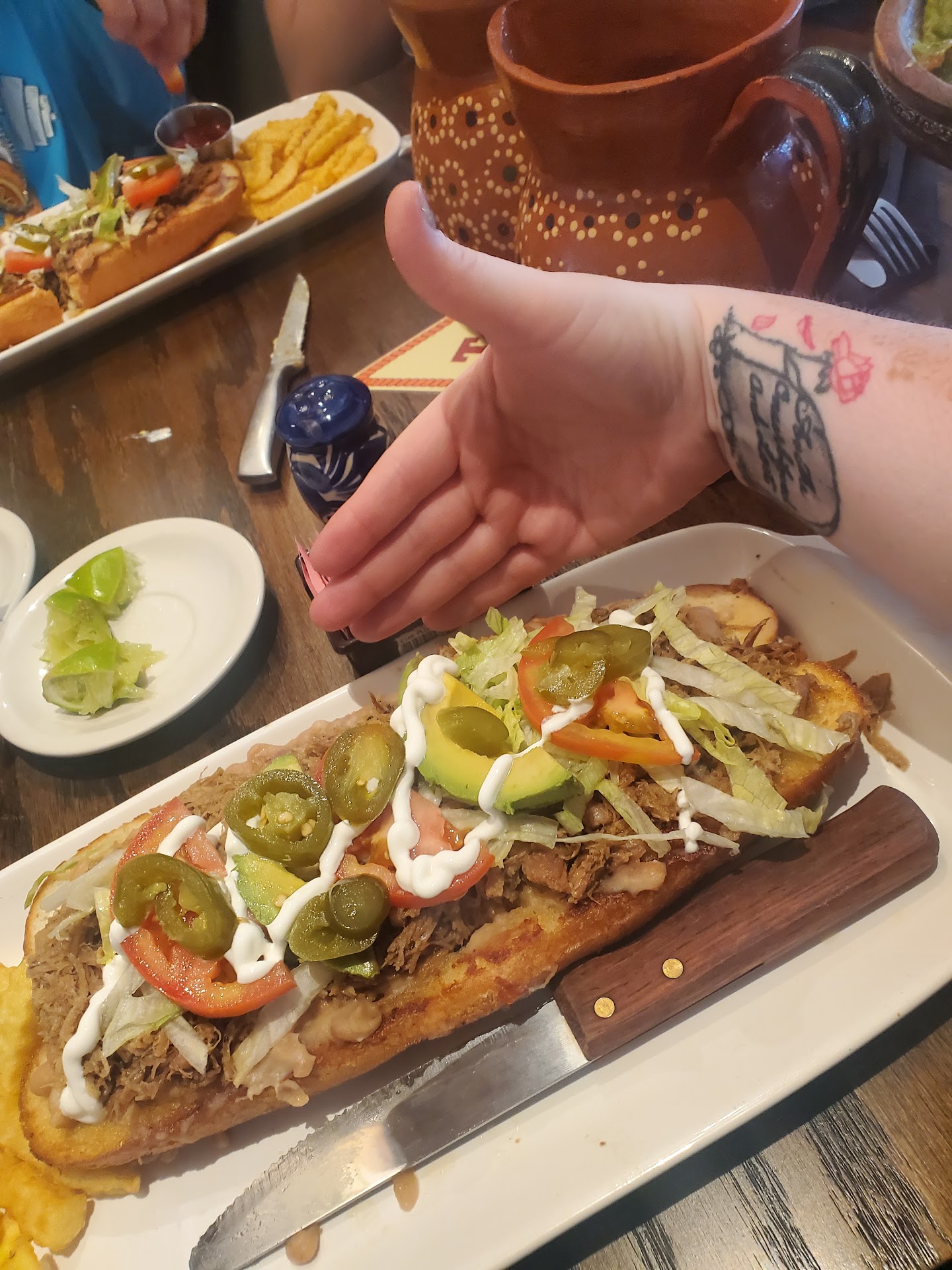Read moreOh. My. Gloooob.... you guuuuuys.... this place is jaw dropping, the serving portions are DEFINITELY GENEROUSLY Texas sized, the prices for said sizes... mercy... fair priced is a bit of an understatement... From the jump the place was quiet, peaceful, the music was at a enjoyable volume but where you can still hold a conversation. Our waiter Chris, polite, respectful and well informed young man who told us about the food and portions but we didn't really think they'd be a big as he said. We decided on the sandwiches and jokingly asked if they were subway sized sandwiches and he said they were similar...nombre, these made subways "footlong" look like a kids meal!!! The drinks we ordered were so refreshing and served in the most adorable "jarritos" and cups, they were the aguas frescas de jaimica and cucumber limon chefs kiss and water was offered your choice of freshly cut slices of cucumber, lemon, lime or oranges. Next the BATHROOMS... y'all, I was pleasantly surprised, touched even, in the ladies room they had wipes, lil disposable cups, a sewing kit and a hand lotion all on a nice little shelf, they REALLY cater and prepare for one's personal needs... IMPRESSIVE. The place is clean and I simply can't say enough positive things... we will DEFINITELY be returning here. We couldn't finish our meals, and v that's something we don't mind, cuz we can enjoy the meal all...