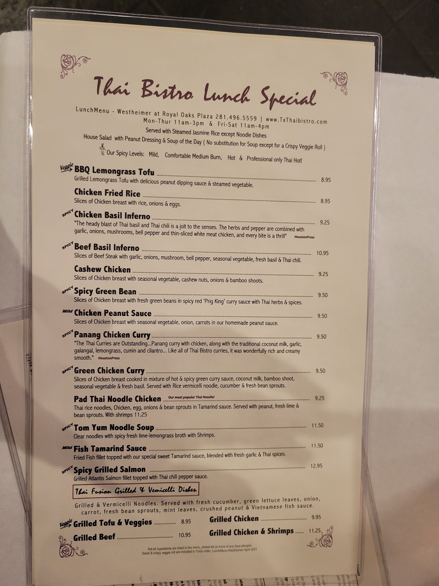 Read moreThis was my first visit, I am a big fan of Thai food. First off I was greeted quickly by a friendly young lady who showed me to my table. She was very helpful with the menu and explaining there spice levels for the spicy dishes. I ordered an appetizer of spring rolls. They were very tasty and cook properly unlike some places where they are full of grease. I ordered the Beef Basil Inferno off the lunch menu and picked the spice level of hot. The lunch special included a small salad with soup. The soup was a very simple yet tasty chicken broth with just a few veggies, very traditional. The salad was very fresh and they use a peanut sauce as dressing. I have never had salad with peanut sauce but it works. The meal came out pretty quickly and was hot and fresh. The presentation was good. The Beef basil inferno did not disappoint. Spice was perfect for me. It was all well seasoned with perfect execution. I will definitely be back to try other things, and definitely Recommend anyone who likes Thai food to give...