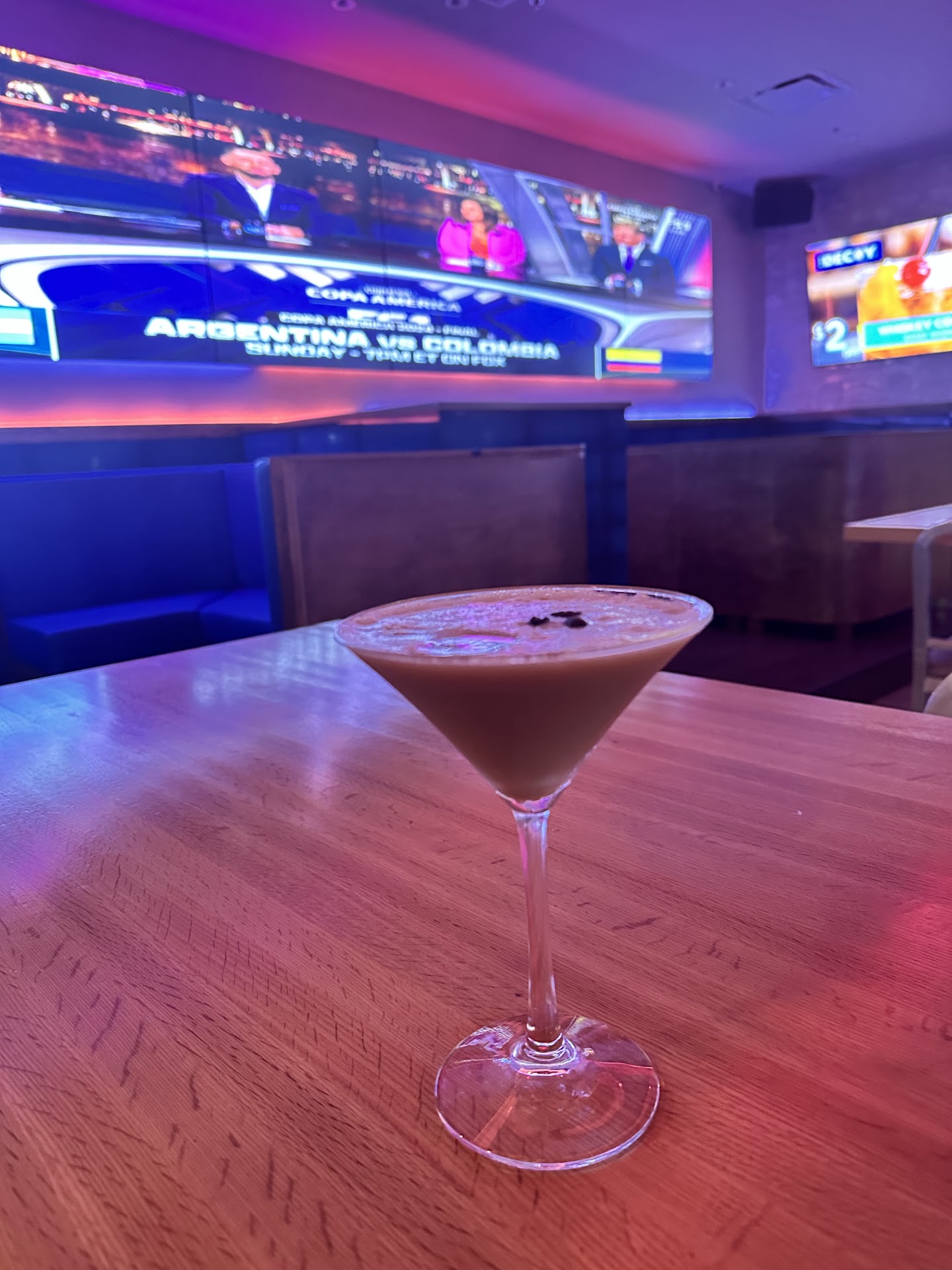 The outdoor area has a lot to offer. Most noticeably they have regulation sand volleyball courts if you're looking to be a little more active. They also have a nice outdoor covered seating area with a large screen for watching whatever the main game on that evening is. Lastly they had some pairs of hanging swings that looked extra comfortable. On the inside the noise level was pretty loud but there were a lot of large, bright high def screens and it had more of a hybrid sports bar / club vibe.