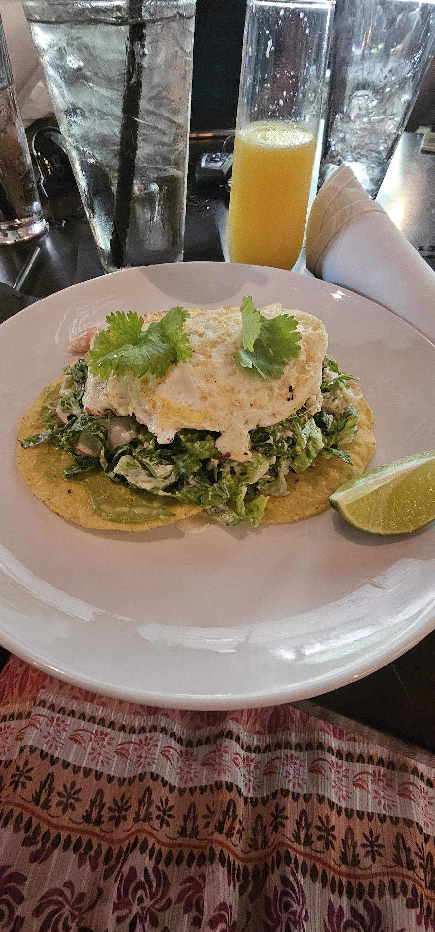 We had a large group for Saturday brunch. The biggest draw for us was the $1 mimosas, but the food was excellent, too. We were there for so long that I ate twice. During brunch, I ordered the Shrimp and Crab Tostada, and my second dish was the Kung Pao Lettuce Wrap. Both were very good.