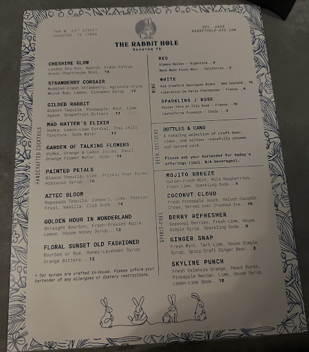 The Rabbit Hole is my new favorite spot in Houston! I stopped by last week and was highly impressed. The elegant, chic ambiance fascinated me, and their drink menu was well thought out! I was also impressed by how excellent the customer service was all around! I recommend looking at the drink menu before you go because of its unique options; youâll probably want to try them all. đ Otherwise, the bartenders are...