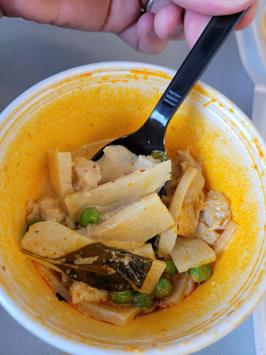 I ordered the red curry with white rice. It was actually quite good! The portion size is relatively big, and the red curry is served in a little bowl separate from the rice which is great if you don't want to eat it all in one sitting or don't want your rice swimming in sauce. While not the best curry I've ever had, the curry was still delicious and creamy with the sweet/savoriness of the coconut milk pairing well with the tender chicken breast and spicy chili oil. Tender bamboo shoots also added some nice texture and flavor. The white rice was also solid, good for...