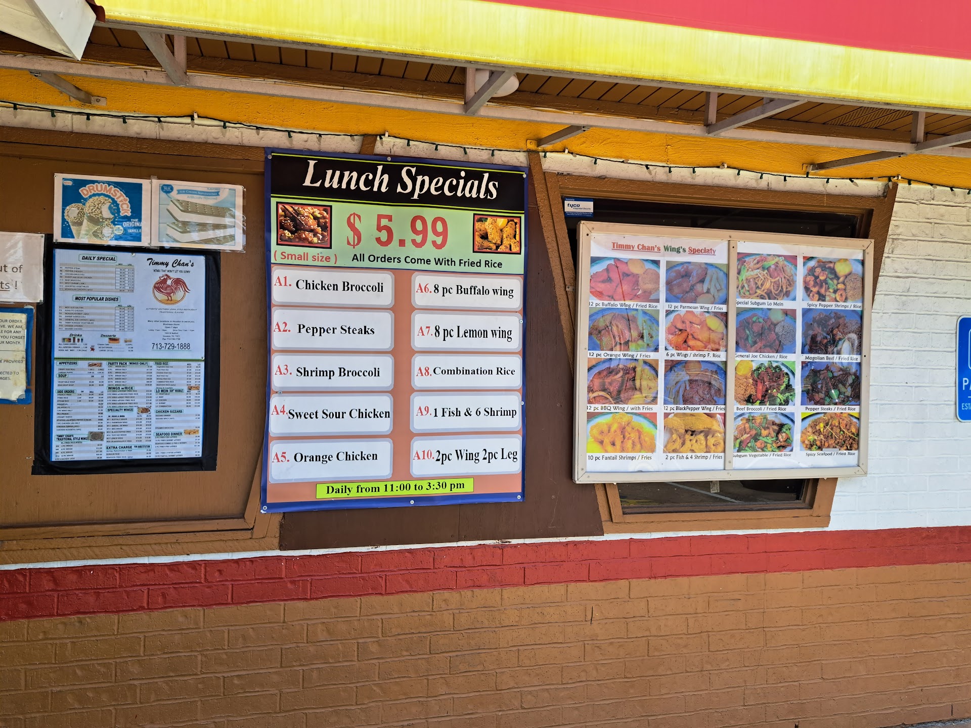Read moreI was near by and was craving some bang for your buck Chinese food. I pulled up through the drive-though and politely asked if they had any lunch specials, they attendant gave back a resounding, and monotone “NO.” After that initial interaction I didn’t feel comfortable and said alright never mind, which they replied by chuckling across the speaker. Anywho, I came to a closer Timmy Chan’s off Texas Parkway in Missouri city! They have daily lunch specials between 11-3PM starting at $4.99! The wings cost a dollar more! Add a large Koolaid, that’s lunch for $9 bucks. Learn from my mistake, if it ain’t broke...