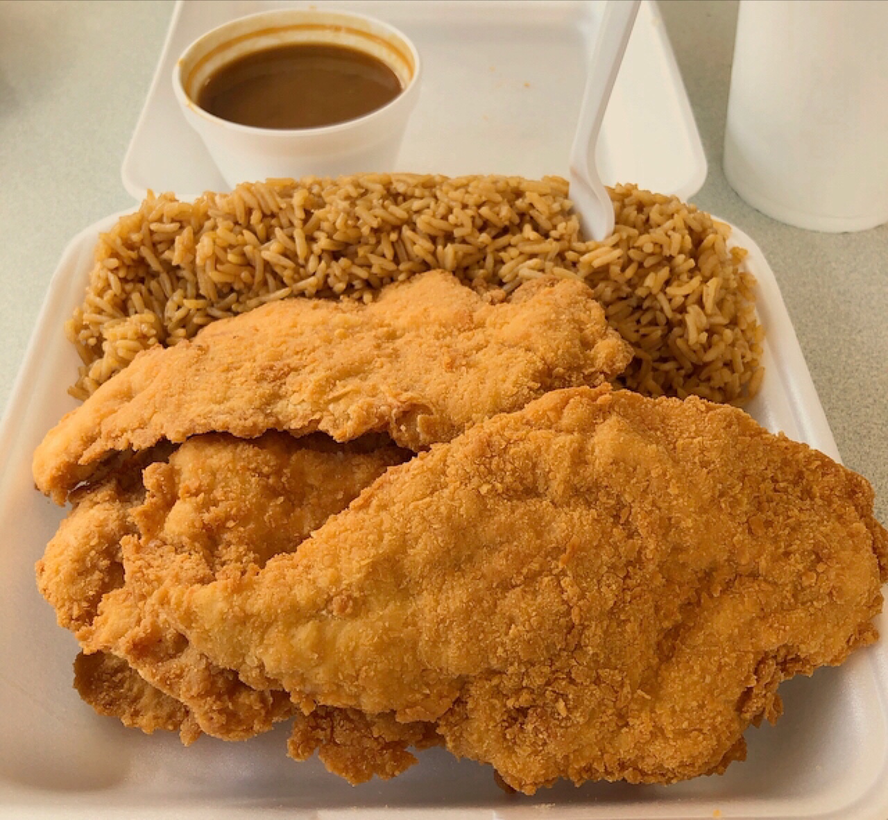 I regularly drive 20 mins to eat here. Pictured here is their chicken strips and rice combo. They give you 5 MASSIVE chicken tenders with plain fried rice and brown gravy. Great value at $7.29 for the combo. Their fried chicken wings combo (5 whole wings, not split = actually 10 wings) is also just as good if not better so you take your pick.