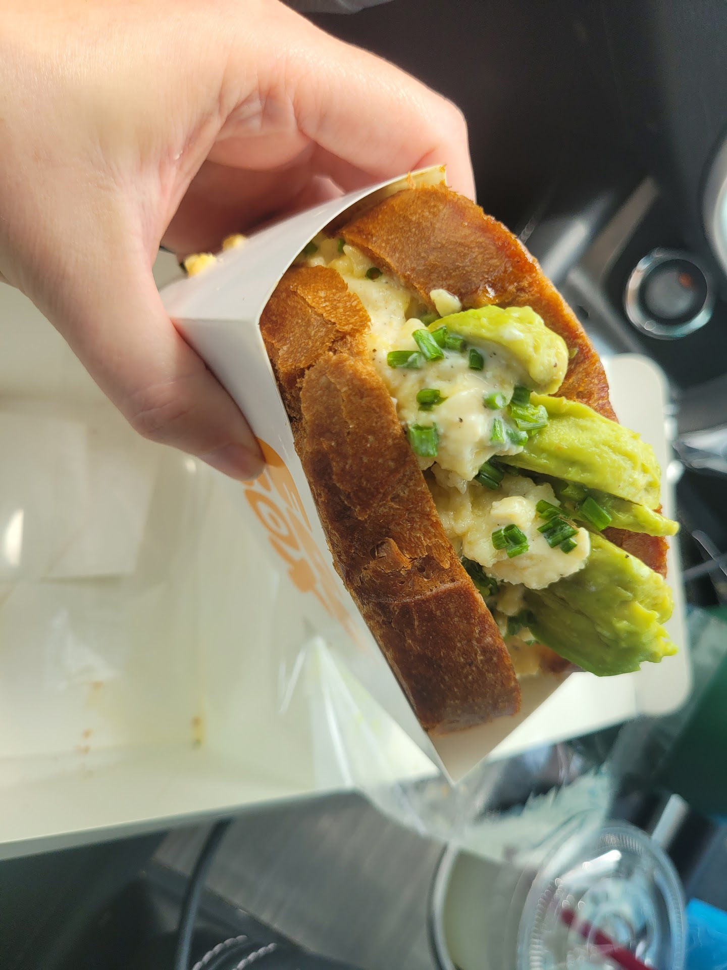 The egg and avocado sandwich is wrapped nicely, aesthetically pleasing. The avocado is placed at the top of the sandwich and not distributed throughout. So you don't get the egg / avocado bite for the entire sandwich. The sandwich is so top heavy from the avocado that the avocado fell out of the sandwich and onto my lap as I was getting ready to take a bite. The egg is substantial but it wasnt as fluffy as i expected it to be. The bread is the best part. It is slathered in butter, super yummy but it gets soggy from the moisture from the eggs.
