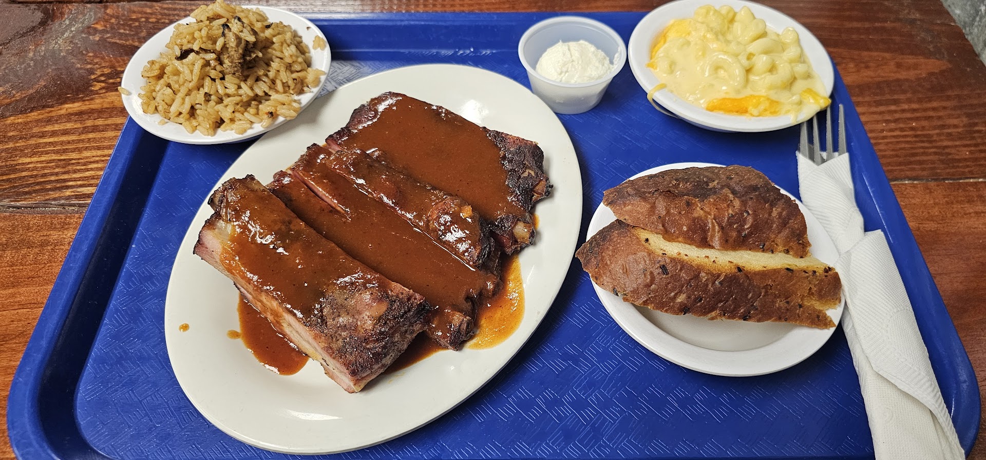 You order your food and it's expensive bbq, ok fine then how does it taste? The ribs were cooked right, but they had no seasoning on it, bland and flavorless. The creamed corn tasted like boiled corn with Velveeta in it, flavorless and the BBQ beans were garbage. The jalapeno bread tasted worse than the bread I might buy at Walmart.