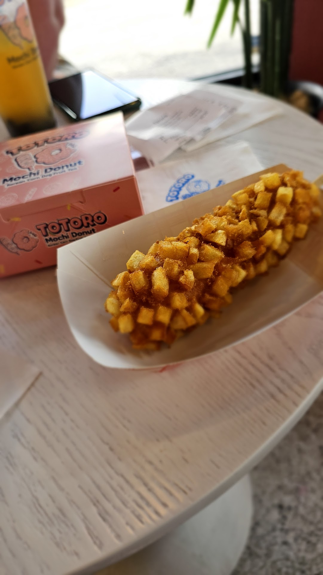 Oh my gosh, I must say these mochi donuts are SO GOOD! They are so soft on the inside and the icing on the outside had a nice firm crack to it that countered each other perfectly. The day I went I tried every single mochi donut (besides the regular sugar one, but I'm sure that one was delectable as well!) I had the Matcha, Vanilla, Chocolate, Honeydew, White Chocolate, and the Orange flavor and each one of them chefs kiss was so wonderful. I got the White chocolate, honey dew, and orange when they were fresh (they brought out a new batch) and the white chocolate one actually reminded me of a fresh Krispy Kreme donut! (if you're into that). Just so delicious! Besides the donuts me and my bf also got the corndogs and the takoyaki. My boyfriend got the regular totoro dog when just the hot dog and a sweet potato dog with half hot dog half mozzarella. I got the the potato dog with half and a hot cheeto dog with just mozzarella. Apparently you can also add the hot cheetos on to the potato dog (i believe with a little extra charge) if you don't want to try two separate things. They were so crispy on the outside and soft on the inside giving you enough dog and cheese in each bite. Even with the straight cheese they don't skimp out on it! The takoyaki was also fresh and piping hot so be careful with your tongue! But otherwise so good! You get all that cheese with the size of the breading! And now for our drinks my bf got the mango slush and I got the dragonfruit green tea with mango popping pearls. Everything about it was so yummy! The corndogs also came with several dipping sauces (you choose which ones) and the teas were so fresh and delectable. The workers were also incredible kind and patient with us and the overall ambience of the place was excellent. I highly recommend coming here and giving it a try! You won't regret it!
