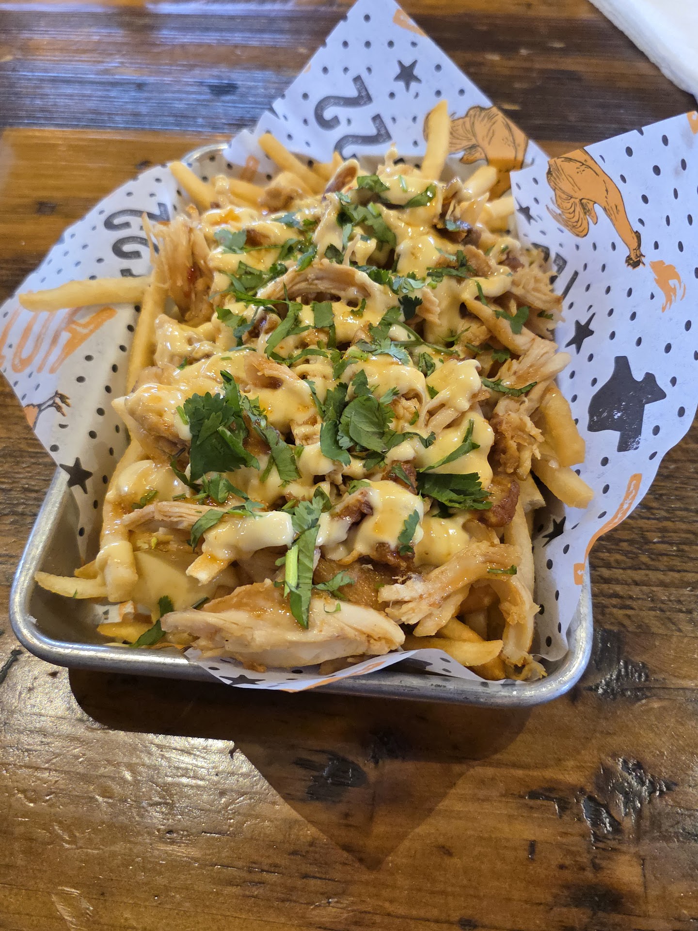 These pack a punchābut not in the way you'd expect. The heat lingers in the back of the throat and warms the sinuses, similar to wasabi, while the mouthfeel remains relatively mild. The mustard sauce is bold and dominant, which might overpower the dish for some, but if you're a mustard fan, youāll love it. The shredded chicken on top is thin and crisp, adding great texture. The fries themselves are left unseasoned, allowing the toppings to shine.