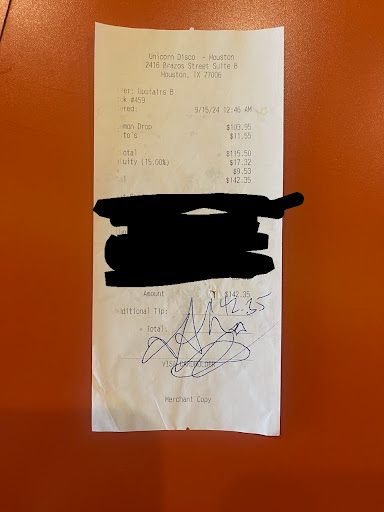 Read moreEDIT** spent 145 and some change on 9 shots and a mixed drink. Gratuity is 15% automatically applied BTW. Unsure if it's for 6 or more ppl or not you would have to ask. Blake reached out to help fix the issue. Turns out I wrote the total amount in the tip line and left the total amount blank. Well technically I signed over it so there was nowhere else to put the total. So the staff read it as an additional 42.35 tip. Im grateful for the assistance I just feel that staff should have looked closer and saw what happened and not approved the additional tip since Technically there wasn't one. It was one of those situations where common sense and morality should have been used. Again, Blake was wonderful in helping me solve the issue. Unicorn Disco is a good bar to go to. Vibes are nice and music is bangin. Maybe just pay in cash to avoid issues like this. Nothing to sign or think...