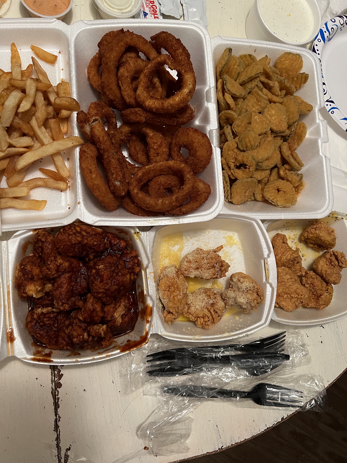 I grew up in the neighborhood and would visit often. I was in the neighborhood and decided to stop by. Let me say the shopping strip itself is always busy. The facility has not changed much honestly it’s always clean for the most part. I got a basket deal they have that comes with 8wings, fries, ranch and a drink and its a similar price at wingstop, but they did have a variety of sides and other foods on their menu. I added and order or celery sticks and jalapeno poppers for $25 which I think was not bad considering the amount each thing had.I wish they had more flavor options as they were pretty basic. My mom ordered the same combo, a burger combo and a 25pc boneless wing order, onion rings, fried pickles and some extra sauces on the side for $65. Price was not bad again the amount these sides...