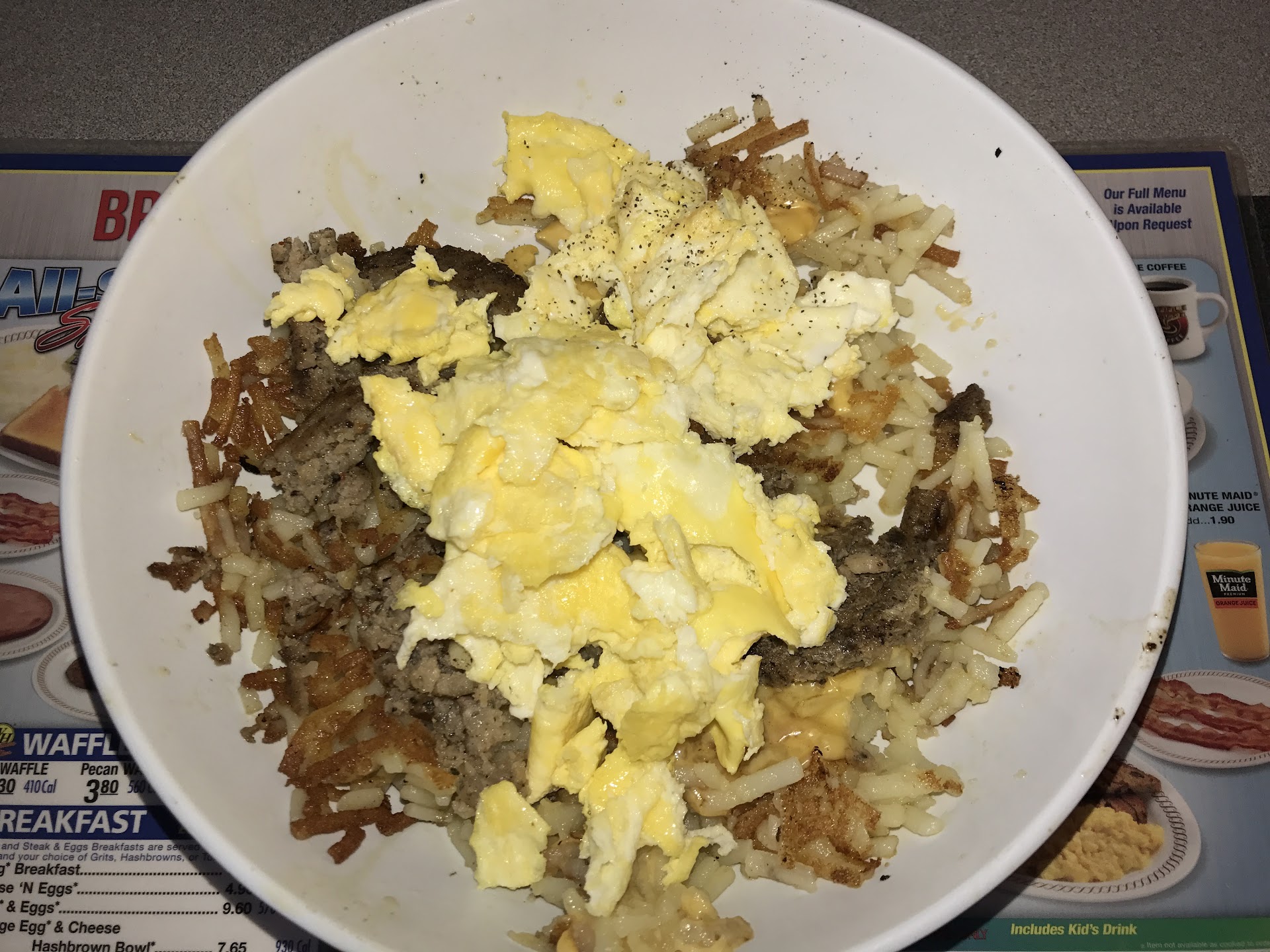 Read moreI have not been to a Waffle House since the early 90s. I was unfamiliar with the restaurant and I expected to find an expansive menu with crazy options. It’s your ordinary diner, find a seat and everything else is straight forward. Everyone in the kitchen was hustling- not one person standing around and all the waiters kept asking to get their plates completed. One loud patron demanded to get food quickly and someone told them to be patient, both laughed afterwards. Food plate was alright, extra points for crispy bacon. The biscuits and gravy were nothing to write home about. I came here out of curiosity knowing well this is not a Snooze/ First Watch/Toasted Yolk concept restaurant, let alone Disneyland. I was pleasantly surprised that the food was affordable, not high as other breakfast diners. If I thought my experience here was very mundane, it was brightened up Mimi, our waitress. I came here for a quick breakfast and thought it would be fun to revisit an old locale I used to be fond of as a kid. Mimi, like the people behind the counter, is all the best that I remember: neighbors, community, smiles, a break from the outside world, conviviality. Mimi was very attentive to our needs and made pleasant talk. Even though a diner can be hectic( everyone is rushing orders for take out, delivery, questions and remarks thrown into the air) Mimi kept her cool and just focused on service. For this event being the first time we met and possibly the last, she made it seem like it didn’t matter, she was here to make the entire experience pleasant.
