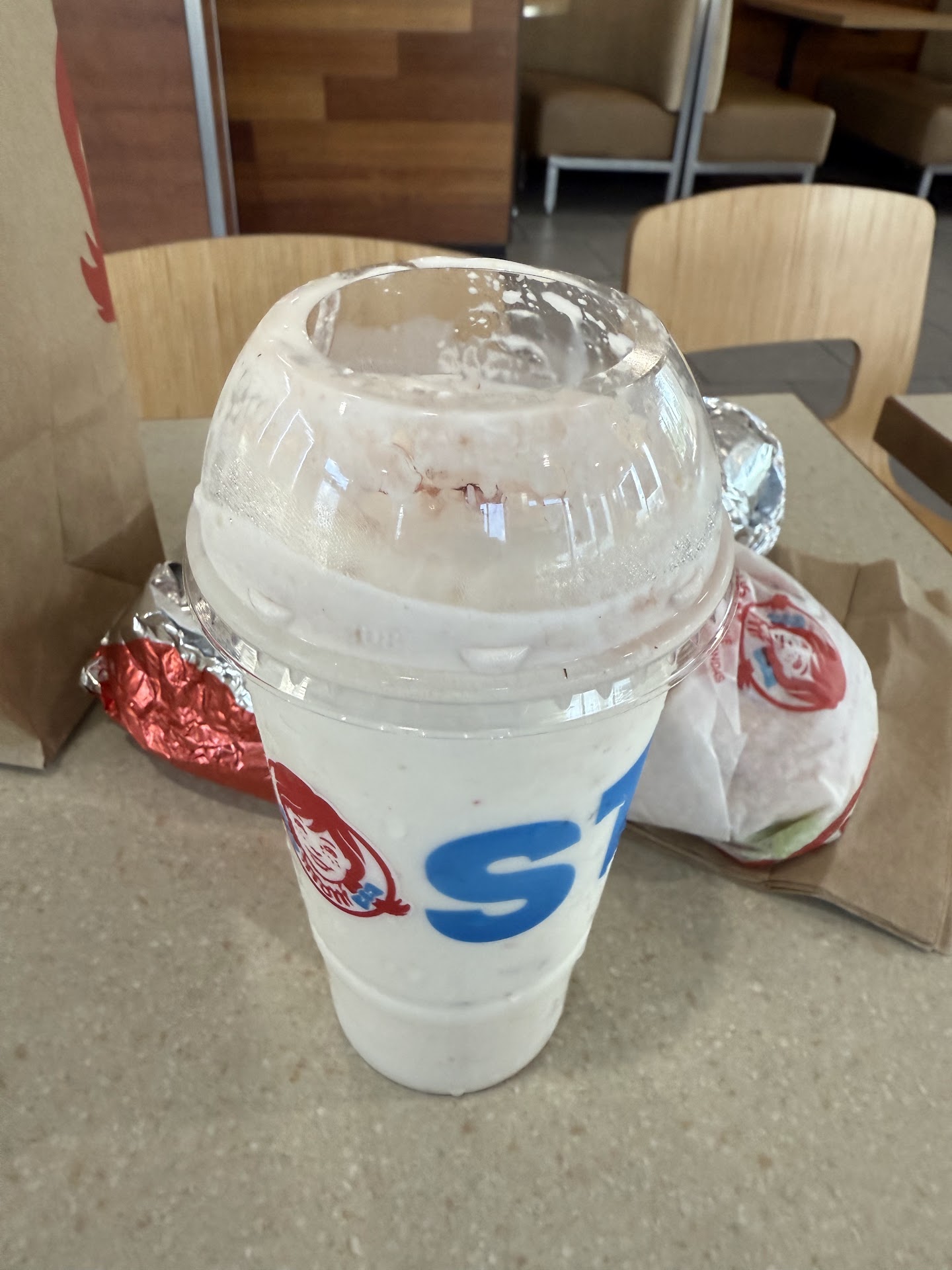 Then they forgot our medium fries too, and when I said we paid for them, he insisted we didnât. The chocolate Frosty we got had the consistency of chocolate milk⌠no thickness, no Frosty vibes. Honestly, I couldâve stopped at Kroger and grabbed actual chocolate milk instead of drinking a sad and lame Frosty.