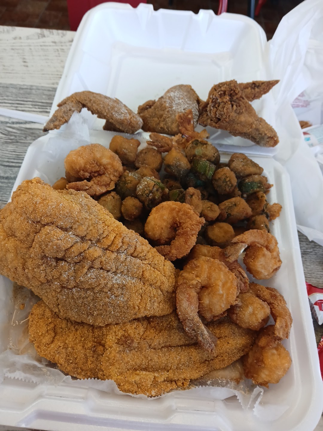 Decided to finally try the place. I bought three plates: Catfish Sandwich (w/Fries), Catfish Nuggets (w/Okra), and Shrimp Basket (w/Cole Slaw & Okra).