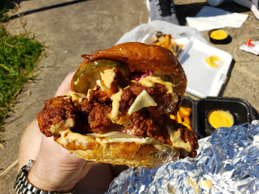Read moreAbsolute Bliss! There is no comparison! Sampled both the spicy Syrian chicken sandwich and the tender basket with seasoned waffle fries. Both were amazing! The chicken is fried with the perfect amount of crunch, yet is still juicy and tender! The seasoning on the fried chicken is out of this world as you first get a taste of sweetness, followed by the hint of spice at the end of each bite. The pretzel bun is soft and light. The kosher pickle tastes amazing and fresh, texture stands alone! Their special sauce beautifully compliments the richness of the chicken. Personally, I’m not a fan of coleslaw on sandwiches, but having got it on the side I gave it a try and it was truly brilliant! All I can say is I will be spreading the word and coming back back for more of this deliciousness! Prepare to have your socks...