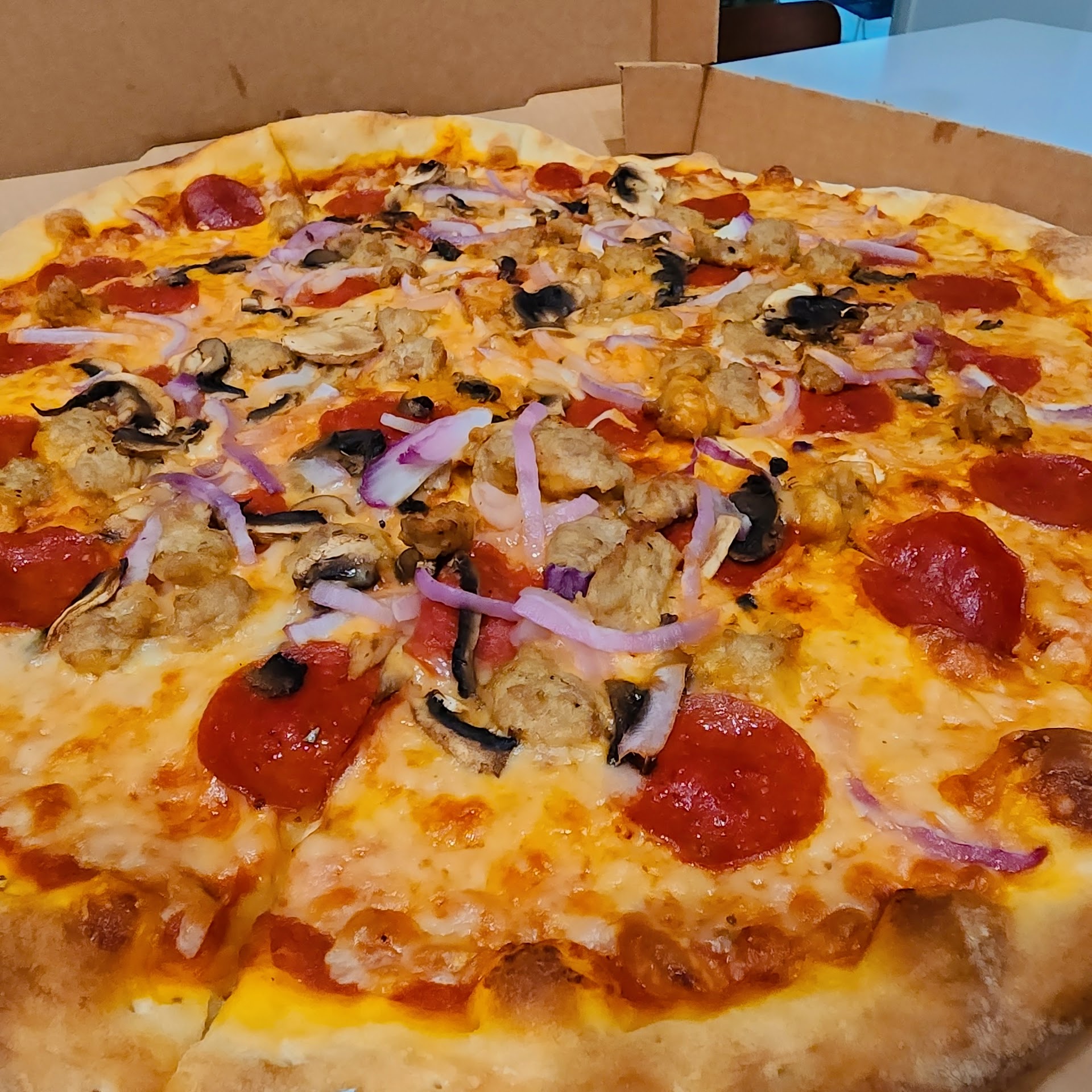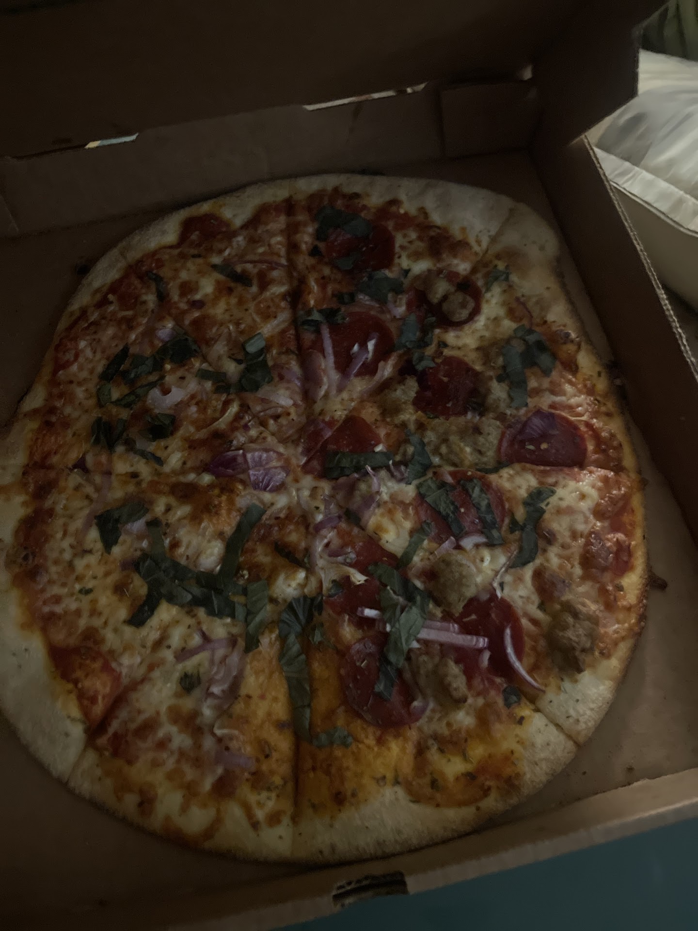 Read moreI wanted to love this pizza, believe me the smell, the way it looked, I thought I would be in for an amazing new pizza experience. I loved the toppings on their own. Sausage, onion, pepperoni, and mushrooms. They all tasted great. I think the first couple of bites were okay, but I felt there was something lacking taste wise. That is why I tasted all the toppings on their own. Then I tasted crust on its own. I couldn't put my finger in it, but maybe something was missing from the sauce or the crust underneath pizza had too much cornstarch, something, but my husband thought something was off as well. Not sure I will try again. Staff was super friendly and I liked the presentation of the pizza. I ate one slice, he...