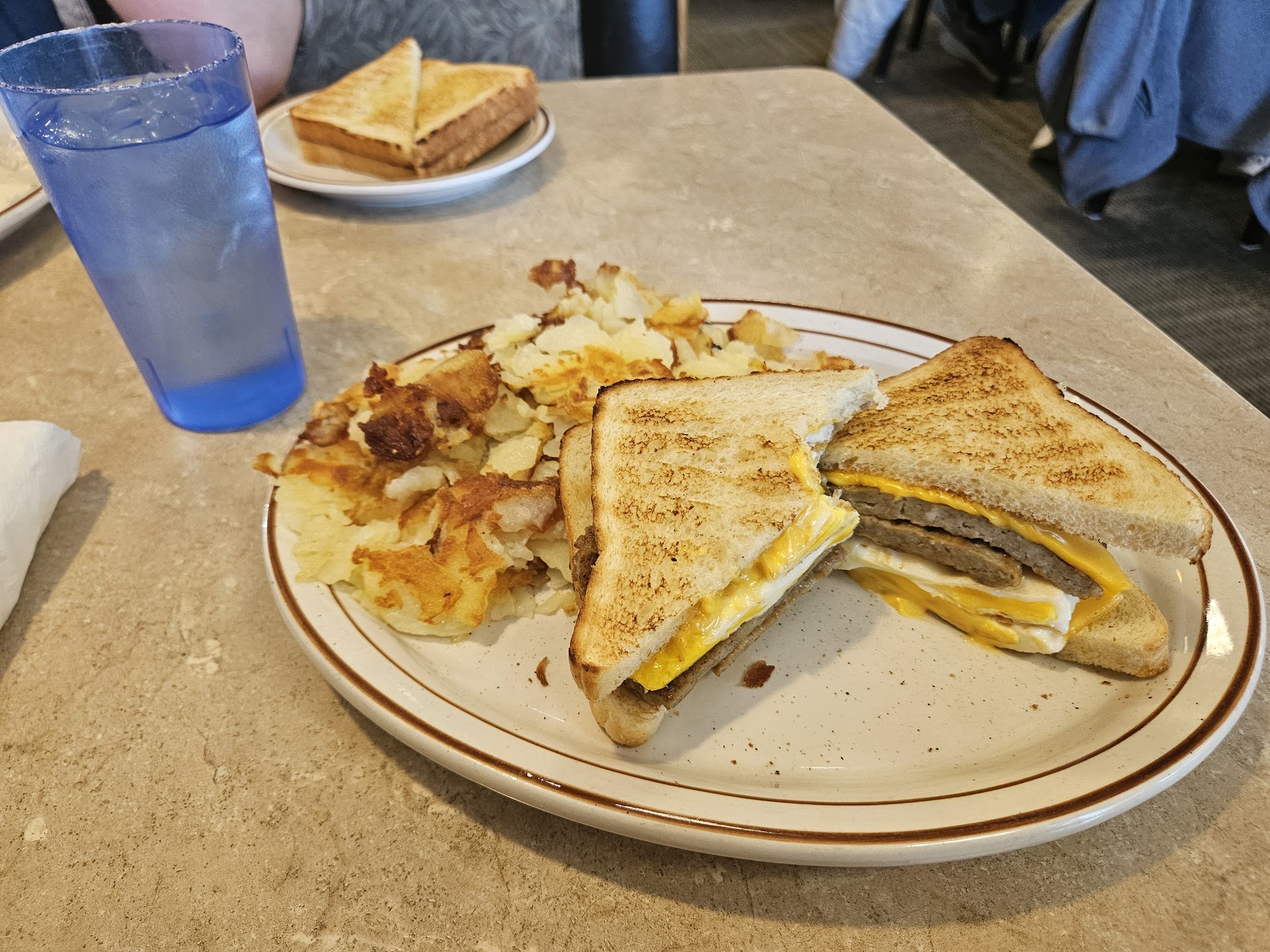 Read moreOur waitress Angie was very polite and connected with me and my friends very well with casual conversation. The atmosphere is cozy and exactly what I look for in a diner. There are some TVs showing seasonal menus and local ads. I ate the egg sausage and cheese sandwich, and I think it was the best one I've ever had. The sausage was phenomenal, and the egg was cooked nicely. My only complaint would just be their potatoes, as I found it lacked the seasoning I was looking for, but that's a personal thing, and they supply you with salt and pepper. My friend got Biscuits and Gravy, and he enjoyed it, as did my friend with his Salmon Eggs Benedict. I'm not in the area for a while, but I'd go again if I had a chance. I'd recommend...