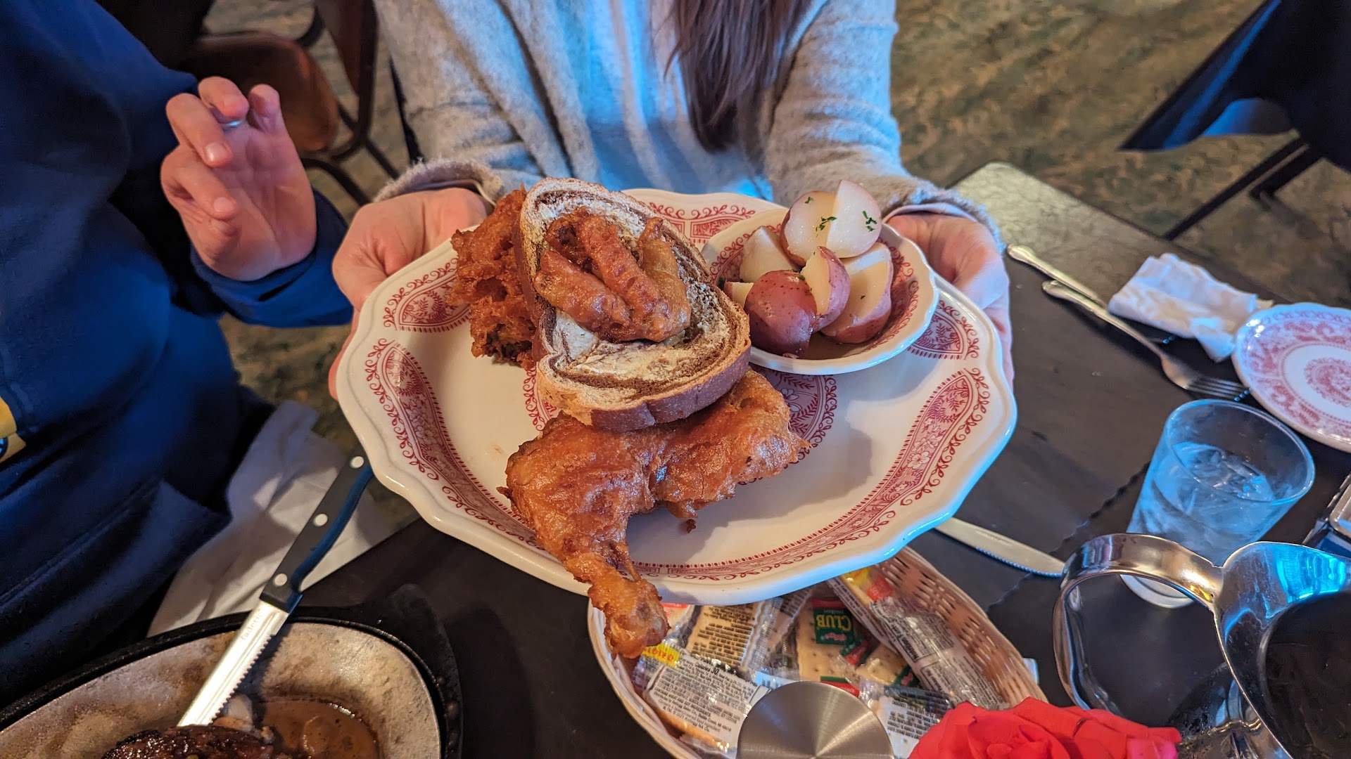 Read moreThis was our first time here and we had heard good things about it. Restaurant is in an old house and has the dining rooms still separated like rooms in a house so very cozy. I had the fried cod with hash browns. Cod was a little greasy but very tender and flakey. Hash browns had the nice dark crisp on the outside but almost mush inside. A little off-putting. My husband ordered the fisherman's plate, comes with shrimp, scallops, perch and frog legs. He told them to hold the frog legs as he wasn't feeling adventurous. He said shrimp and perch we're both very good but three out of his six scallops were still raw in the middle. Our son had the gourmet fried shrimp and a baked potato. Can't mess up a baked potato and he thought the shrimp was also very good. With an hour and ten minute wait, a packed bar area, and snow coming down, we thought, overall, a solid three. We're putting it on our list of good fish places to eat on a...