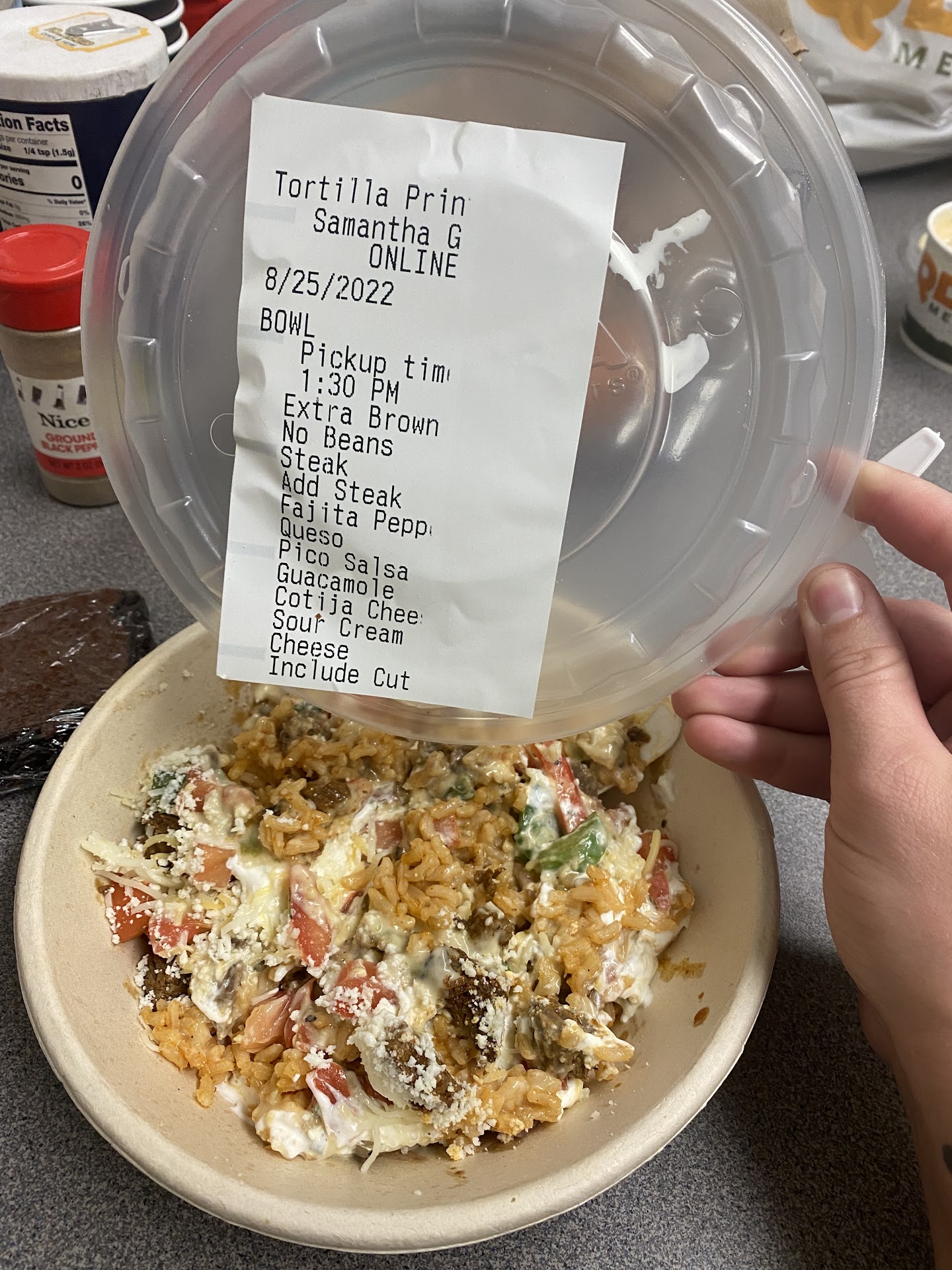 I placed a pick up order today, had ordered extra protein and corn salsa. When I arrived home, I noticed there was barely any weight to my bowl. Looking through it, I noticed multiple ingredients missing, it definitely did not look like extra protein was added, and the amount of rice was just sad and it looked like a smudge of guac was added. I took it upon myself to drive back.