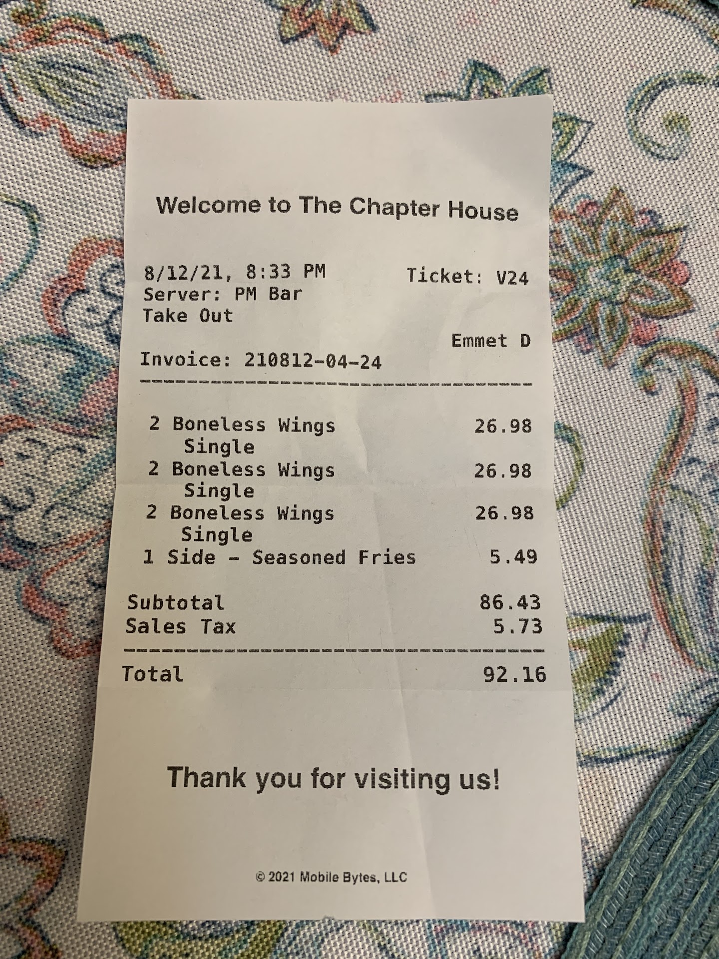 Absolutely the worst restaurant experience Iāve ever had. First off, I called ahead of time to ask how many wings come in a single order, which they should have told me for both bone-in and boneless, but they only told me for bone-in, not clarifying anything. I call them back to place the order for 3 single orders of boneless wings and a side of seasoned fries. They told me 20 minutes. I show up and the bartender tells me that I didnāt clarify how many wings I wanted⦠I was a bit confused because they told me 8 wings per order over the phone. She said that there are only 4 boneless wings per order⦠so I then had to order double because four wings for dinner is not a enough. Never apologized for telling the wrong information and instead blamed it on me. Bill comes to $92.16 for 24 BONELESS WINGS AND A SIDE OF FRIES!... Get home to eat and the āboneless wingsā arenāt even edible. Extremely tough and dried out completely. The fries were not seasoned and were instead soggy as all hell⦠They gave a container full of blue cheese dressing and celery, which was kind, until you bit a piece of celery and you realized it was old⦠extremely disgusted with the Chapter House in Howell, NJ and you should be ashamed of charging someone $26.98 for 8 boneless wings! I think giving this place a one star review is generous of me. I will never come back to this location nor tell anyone to come...