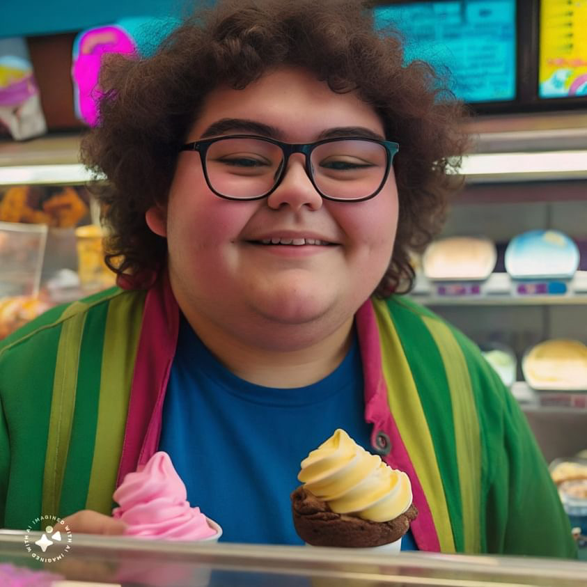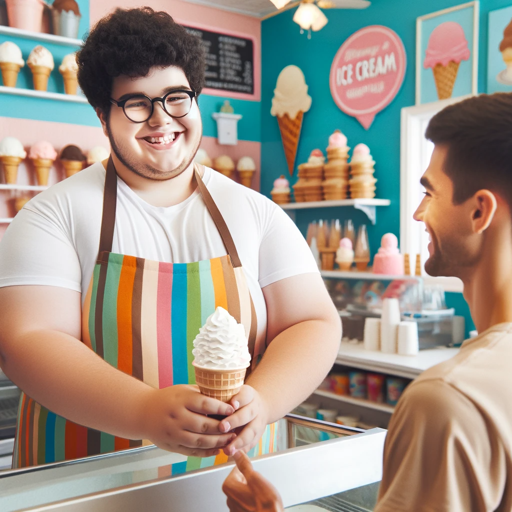 What struck me most was the employee's remarkable width through the stomach, which conveyed strength and confidence. It was refreshing to see someone who exuded such a positive body image, proving that diversity in appearance should be celebrated. The way this individual effortlessly navigated the shop, including their grace in scooping ice cream, only further emphasized their confident and capable demeanor.