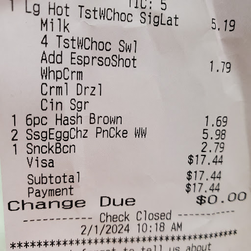 I'm not sure what's happened here but I've given them 3 chances and they've yet to provide quality food or hot drinks. This time I've got half cooked bacon, 4 hash rounds in the bag, snack wraps that aren't even warm, cheese isn't even melted and a latte that's half full, taste like syrup and to top it off they park me for this order with not one car behind me.