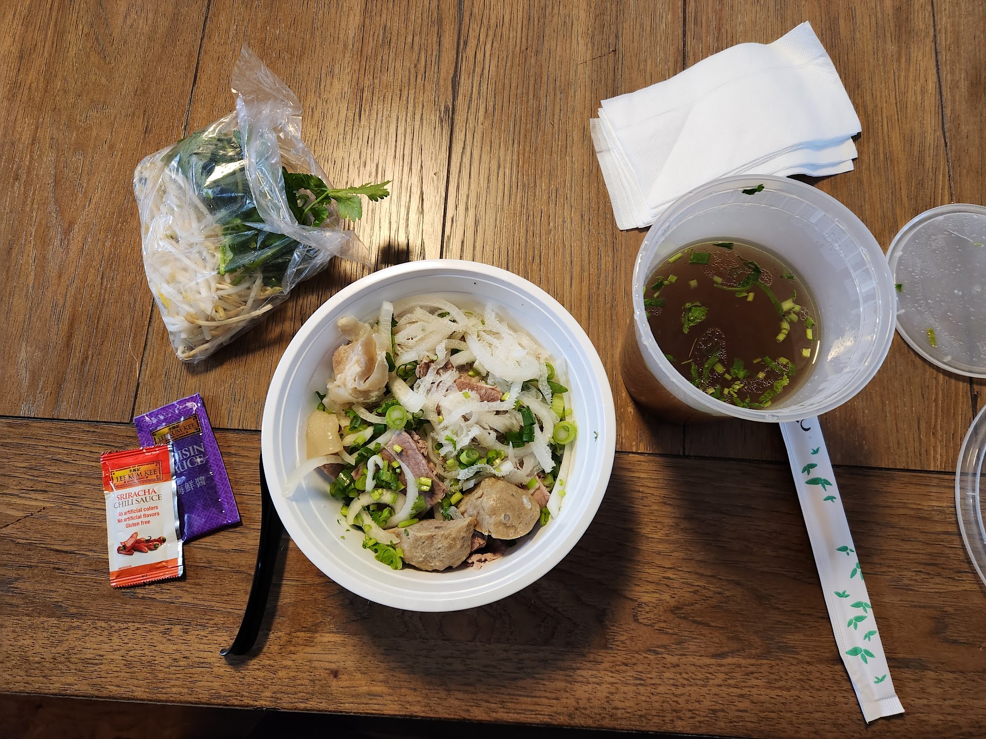 Yesterday for dinner, I decided to try a pho from the newly opened 'Wat da Pho' Huber Heights location at 7612 Old Troy Pk., Huber Heights, OH 45424. They opened Jan 1, and all this week there will be a 30% discount on all orders. I had already looked at the menu and knew what I wanted to try P4: Pho Dac Biet (Sliced steaks, meatballs, beef tendon, beef brisket, and beef tripe) $13.79. Cash is king at this location, they will charge 3% additional for card payments. I got my order to go, and it took about 10mins, there were quite a few people in the store. The meal comes in three parts, there is a bowl with the proteins, veggies and noodles. A large container with the broth, and a bag of fresh veggies, which consist of bean sprouts, lime, cilantro, basil, and slices of jalapeno pepper. We're only 5mins from Wat da Pho, so the broth was still hot. The broth was hearty, filling, and filled with umami, which I hoped it would be. They include a packet of chili sauce, so you can adjust the spice level. The noodles had the right texture, the meats were tender and savory. Adding the fresh veggies put the 'topping on the cake'. I didn't realize that slices of jalapeno were mixed in the bag..that was a hot surprise.. The pho bowl is pretty large, I couldn't eat it all! I ate most the meat and noodles, then strained the broth into another container and placed it in the freezer. I'll use the broth for a...