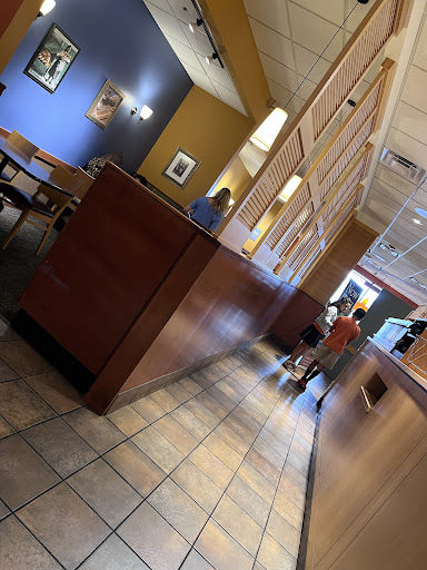 Interior is your typical Panera. But the flow is horrible! The entry is crowded and how people would move around to get food and sit down is convoluted. On top of the poor flow of human feet, the bathrooms are super small, gaps in the stalls far too large (peeping eyes beware) and someone needs to do a good detail.