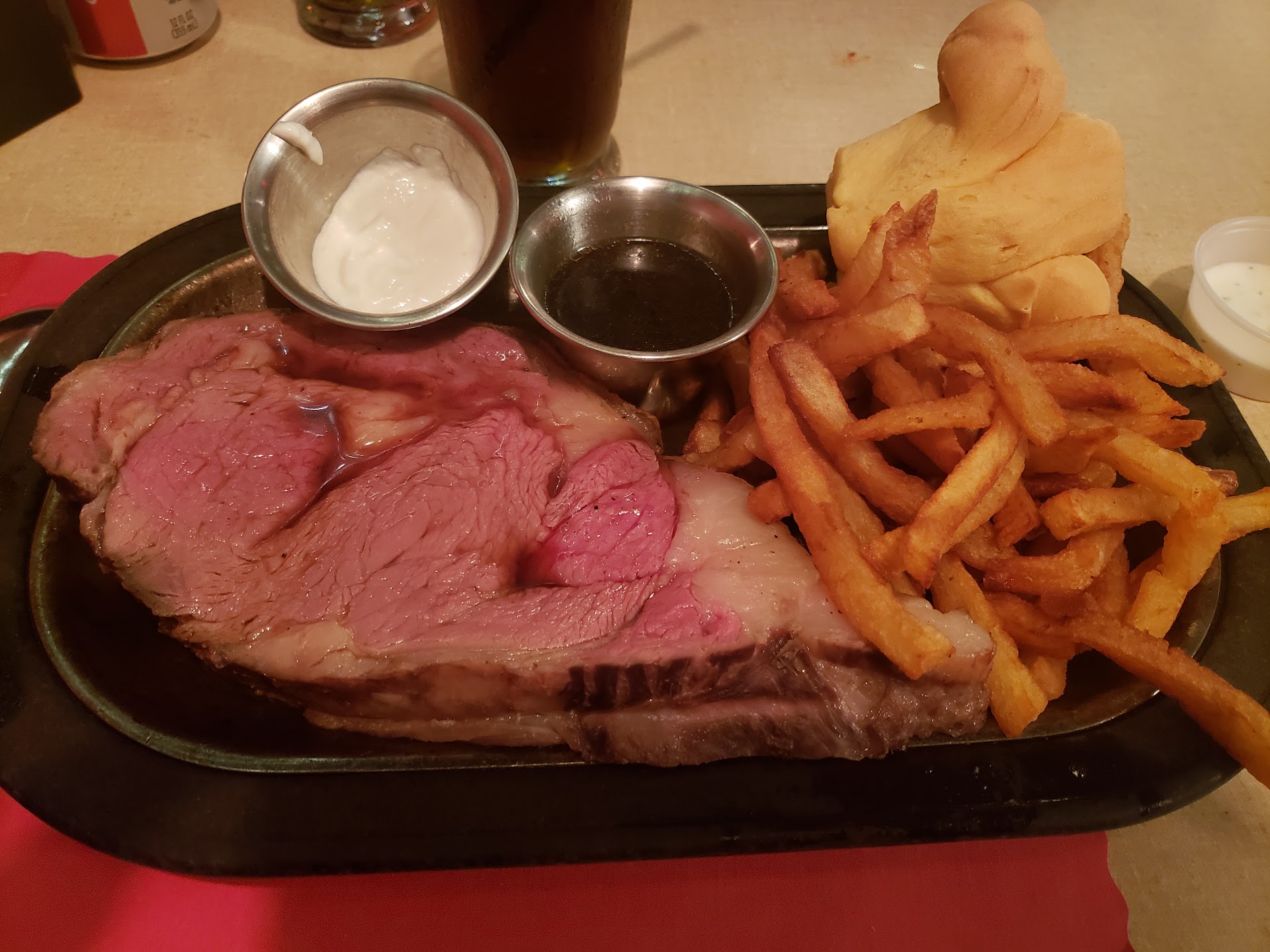 Read moreThe prime rib was good, nice and tender prepared medium, but the menu price was mis-represented by $9 when I got the actual bill. I've seen menu prices differ by a couple of dollars before when no-one gets around to updating the prices, but I've never seen that much. The service was good (at least for me) considering there seemed to be only one waitress for the whole restaurant and the place filled up quickly after I got there at 6:00 on a Tuesday. The lady who seemed to be either the manager or the owner was taking some drink orders, a girl was bringing out vegetable trays and taking care of the checks but I can't recall seeing anyone run plates of food to the tables besides the one waitress. A large private party was seated in a room off the main dining area and they started poking their heads out the door to see if anyone was going to take their food order. Seems like the poor waitress was overworked and the duties could be spread a little more evenly across the available staff. Overall, the food and service were good, but I've had better prime rib that didn't cost anywhere near $40.95. Would rate 5 stars but for the large...