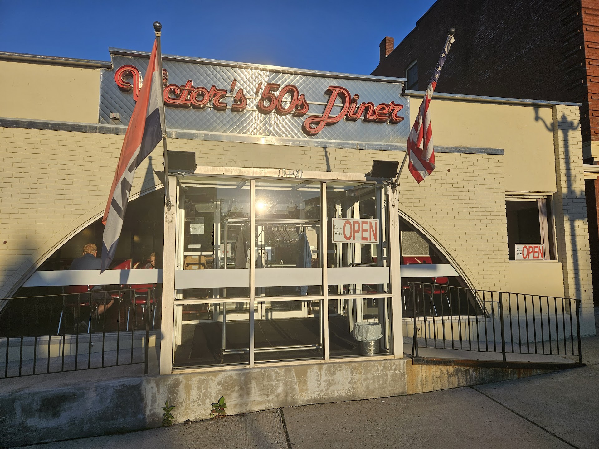 Breakfast is noted as an important meal and Victor's fulfills that need with speed! This diner is named after Victor Tzakis coupled it's 50's posters of Elvis, Marilyn, and the Rat Pack equates to the name. My crew slid in at the cool hour of 6:45 ready to eat. We were greeted as we waltzed in the door. Asked if we wanted a booth or a table. We elected for a table. Menu presented, specials given, and drink orders taken. We took a breath and discussed deep topics. One member of the crew was overwhelmed by the options. To boot he is a Greek, but he played amateur hour and we retreated back into our parlance. He was tasked with making up his mind. The server was patient and kind. Johnny K eeny meanied. Selected ham, rye, 2 poached eggs, home fries, and French toast. He drank his coffee dark like his soul. The next guy ordered two eggs fried hard. His toast was marbled rye with French toast. Home fries came with it too. I.C. ordered pancakes as from my other reviews you realize...he knows his pancakes. Side hustle of sausage and biscuits were ordered, home fries and eggs fried. I have to suffer with hangriness for having to meet these squares at 5:15 in the morning knew all along what I desired. With no hesitation 2 eggs scrambled, sausage gravy over biscuits with grits. Server did not bat and eye...We talked about break dancing at the Olympics having moved from the topic from before. Before anyone could speak on the idea of....Food began to emerge. First the home fries...They were underwhelming with lots of paprika. However, all our eggs were cooked to perfection. I eyeballed perfect poached eggs. My friend's fried eggs were hard and IC's yellow toast dipping yolk ran for his fried eggs. The grits were instant grits, but they were warm. Just plain grits. The sausage gravy was delicious. I would describe the gravy as creamy with peppery tones. The biscuits grilled on the flattop were super. The biscuits were dense but not crumbly....A plus...they were dense with great mouth appeal is the best way to describe them. Paired with the peppery sausage gravy...spoonfuls of the gravy were ladled by yours truly onto the biscuits. The gravy came in a small bowl on the side. I appreciated this. This allowed the gravy to be mixed in by me with some of the grits too... I was beyond happy. I had a water, two friends had coffee, and one a diet coke. The coffee was rated as a good cuppa. Now the pancakes were deemed B+ by IC. IC said the batter on the pancakes were dense and the batter cooked unevenly thus some dry moments. Still a B+ from this pancake monster means a good cake. IC likes fluffy pancakes. These were not rated as such more...just not airt....these were also good size. This may have contributed to the texture. The group agreed this place was a solid A establishment. The server was realllly great and we were not rushed.