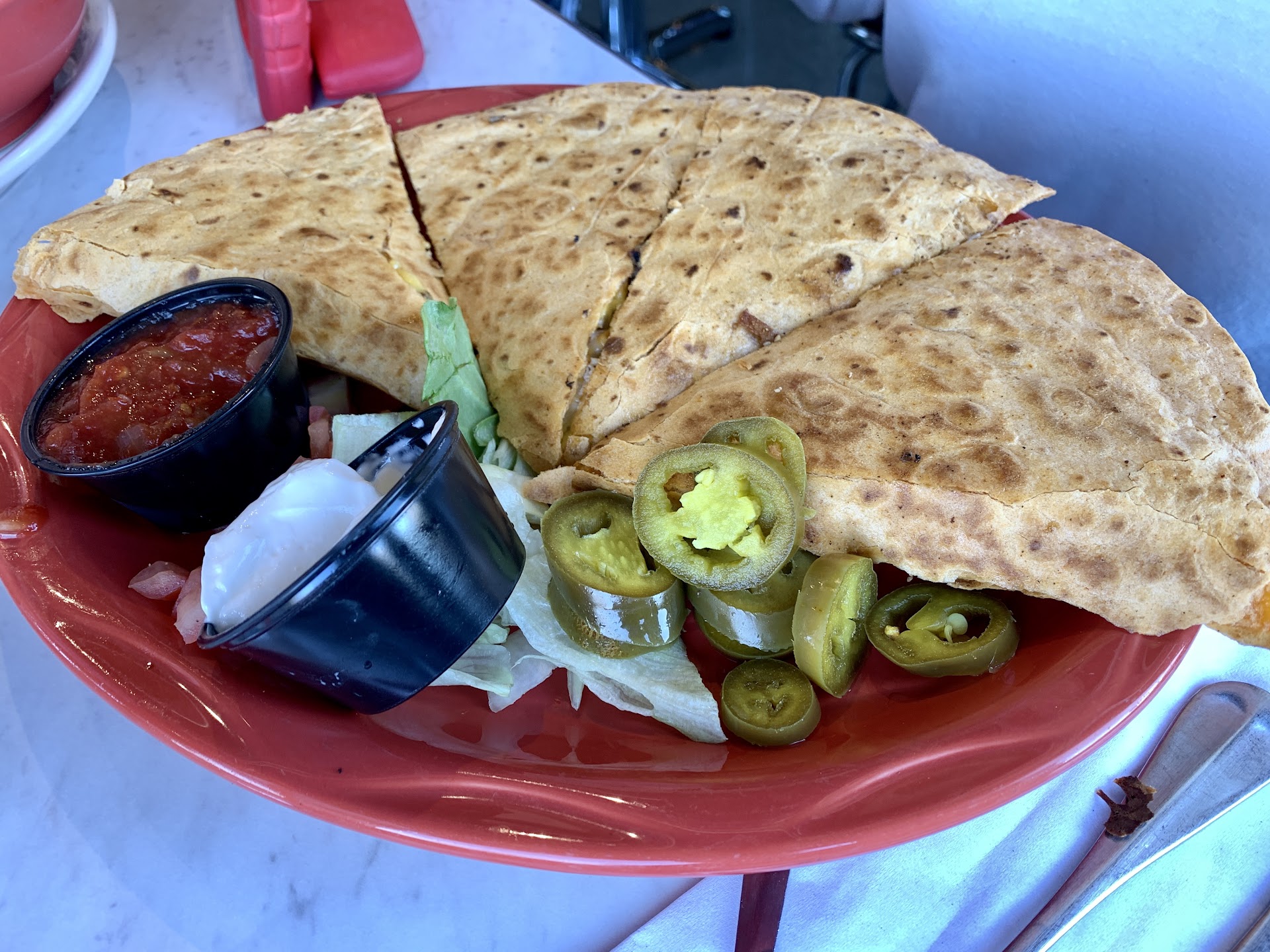 Foodwise, we like the Napa Spinach Salad...and the optional grilled chicken or salmon is the perfect addition, but it does bring the price to $17+ and $19+ respectively. It is a nice salad though! But remember to order the single, small roll it comes with because you'll rarely be asked and it won't be served otherwise. We've ventured to try other things on the menu, but we are usually disappointed by the taste, the greasiness, and or the value. Except for entrees, many things do not come with a side, i.e., a $12+, 8oz burger doesn't even come with chips...what? You have to upgrade to get some additional items to make it a real meal. Although, upgrading is less costly than ala carte. And serving sizes are decent to generous!