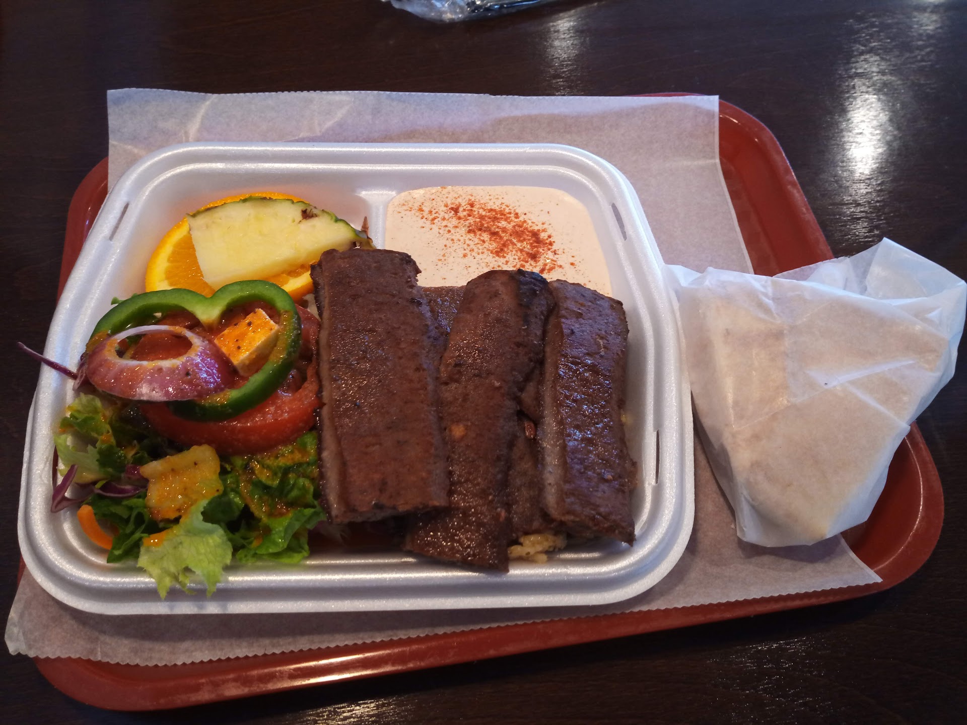 ย ย ย Read moreI got the 'Lunch Special' Gyro plate with a drink. The Gyro meat was tasty and generous amounts. It came with a salad, wild rice, Tzasiki sauce and a couple of slices of fruit (Orange and Pineapple) and some Pita bread on the side. Portion sizes are rather small. The Salad was tasty with a nice dressing on it. The rice was so-so. One major flaw. EVERYTHING they served me was on Styrofoam or Plastic forks. When I placed the order, the first question the lady asked me was if it was 'for here or to go'. I was going to dine in and assumed that they would use real plates, forks etc. WRONG! There was not a single item that would have been reused. Why bother. Everything went in the Trash. Ridiculously high toll on the environment. So for sure, will not return to The...