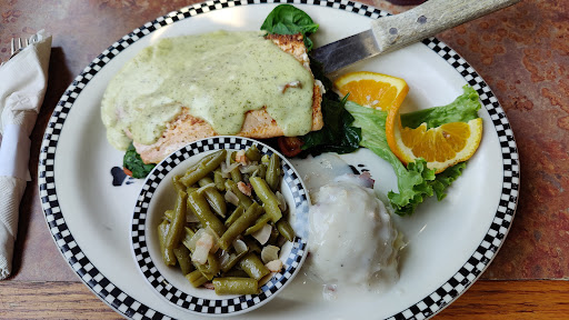 The food itself was "okay.' We both got the pesto salmon, green beans, and mashed red potatoes. The salmon was decent, though nothing special, green beans overcooked (but tasted good), as expected in a restaurant like this, and the mashed potatoes were okay, though the gravy had an aftertaste that was a little off. Not sure what the mix is but wasn't really that great-tasting. Presentation was not bad, though.
