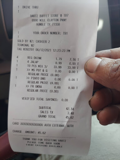 Firstly, even with the Senior discount, it was the most expensive Hartz Buffet I had ever been to. They had no meat on the buffet when we got there. We kept having to ask them for meat. They would bring about six pieces of fried chicken out and then you had to wait on more. We asked for Hot wings three times and 45 minutes later got fried wings with no hot sauce. Then we had to wait on hot sauce. I will never go to this location again. Two people brought back to go orders, while we were dining. Both of them because they weren't packaged with the wrong amount. The cook did a great job with flavor, it's just a buffet usually is filled with a variety of things to eat and this had no chicken until you asked for it. I was extremely disappointed with this location. That makes two locations in Humble that I will not revisit. It's honestly worth the drive to LaMarque for the best Hartz Buffet ever. I will make that drive, next time or try the one in Alvin again. The ones in Houston have poor customer service, lack of options and are truly not worth the newer higher prices. I did try the one in Baytown last month. That one was very good. Food was hot, fresh, and delicious. My favorite is liver and gizzards with lots of cream gravy on top. Southern comfort food...