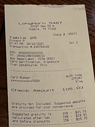 Read moreUpdate 1: as you can see from the response below I was contacted by Longhorn's customer relations department. They did a great job trying to resolve the issue. I've updated my rating from 1 star based on the customer service. I'll do a second update once I've dined at the restaurant again.
