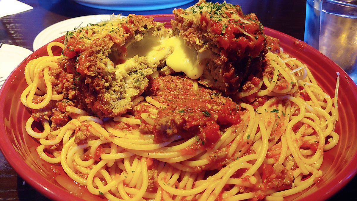 For the main course I had one of their fall specials - the "Meatball Majore". It was a plate of pasta with a huge mozzarella & parmesan-stuffed meatball. The entree comes with pomodoro sauce, but I got it with their Bolognese meat sauce. It was outstanding! I loved the Italian seasonings, the traditional flavor and signature taste of their meat sauce. The massive meatball was delicious by itself. When I cut it open, the cheese oozed out all over the pasta. The entree was so big I took leftovers home and made two more lunches out of it! (see photo) My wife got another of the fall specials: Chicken Scarpariello. It's chicken braised with italian sausage and peppers in a kind of sweet-and-sour sauce. She gobbled it up! And if you have a sweet tooth, you can't pass up their Cannoli Cake. It's made with tender layers of cake permeated with a chocolate liqueur syrup and frosting layers made with a combination of cream cheese, mascarpone and ricotta, then topped with a mini Cannoli. The sides of the cake are also covered with semi-sweet chocolate chips. It is absolutely fantastic. But be warned, it may take 2, 3 or 4 people to eat the gigantic slice of cake they bring you!