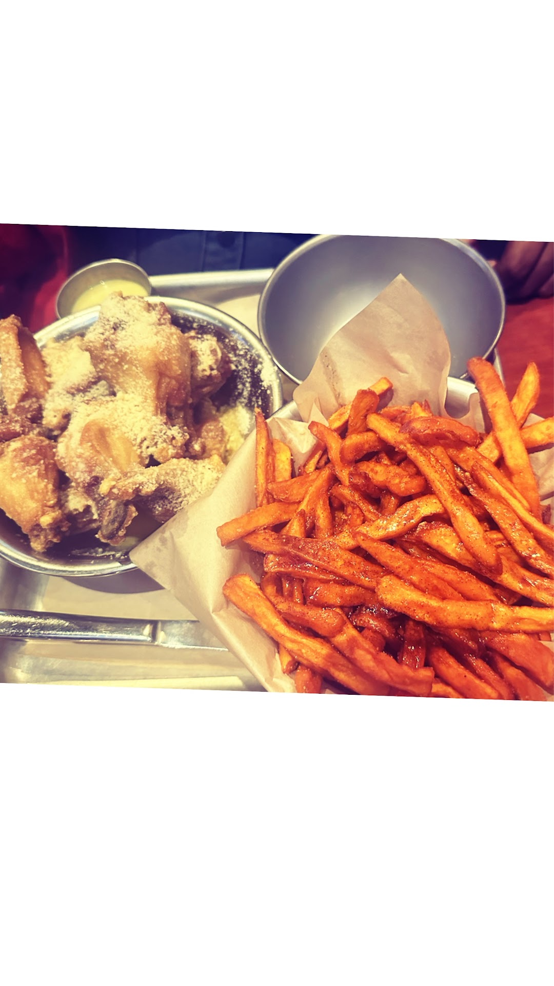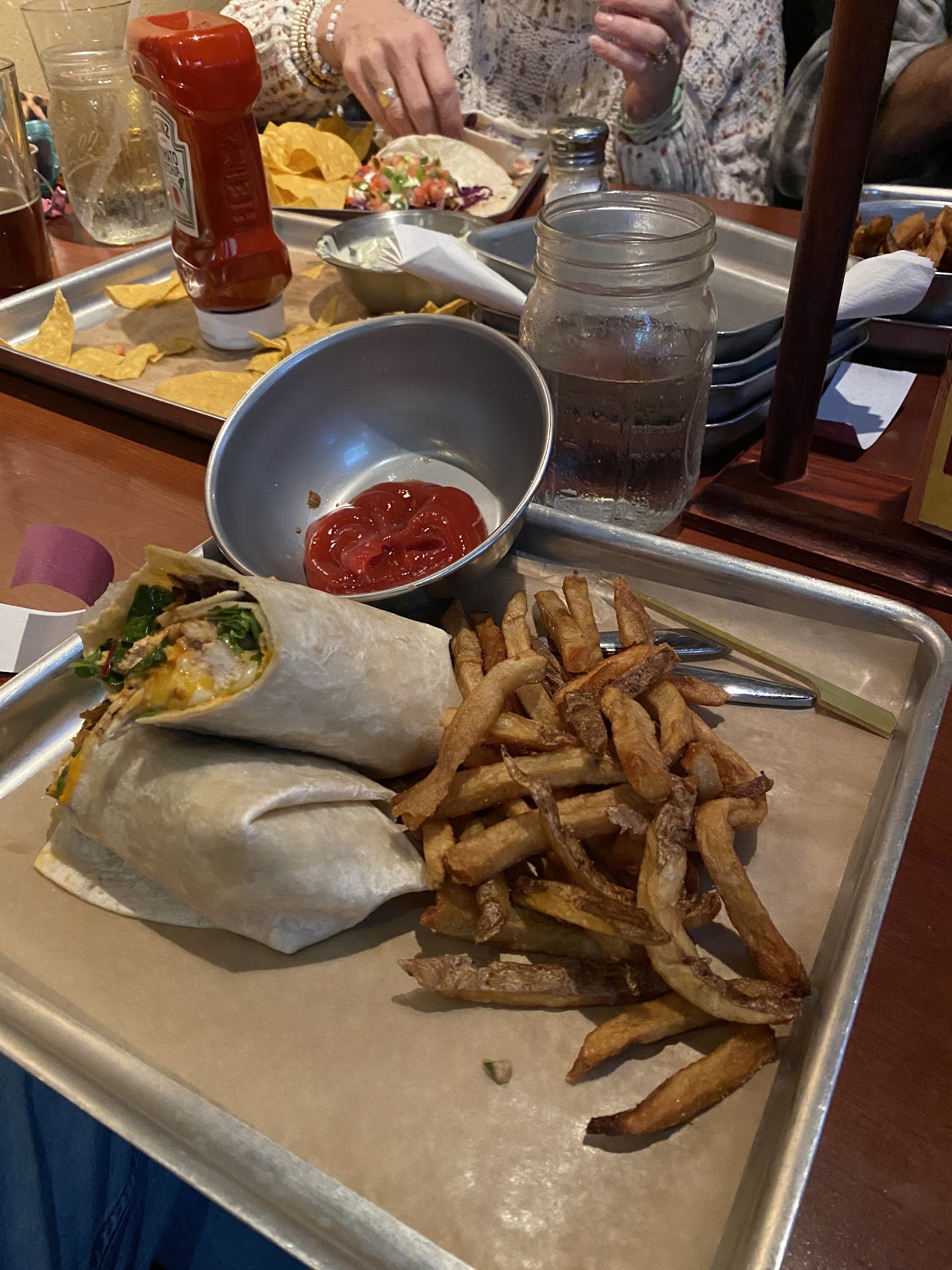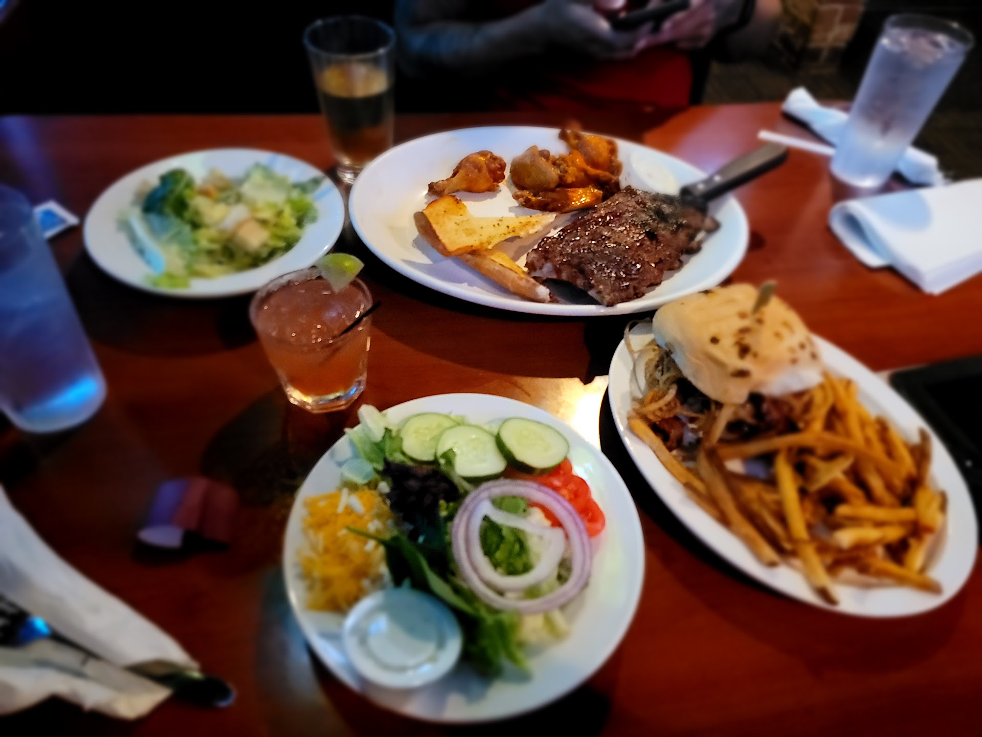 The food was a mixed bag. We ordered an appetizer of queso and chips, but the chips were so greasy that they glistened. My steak salad was a hit, my sister enjoyed her salmon, but my niece found the wings too greasy, similar to the chips.