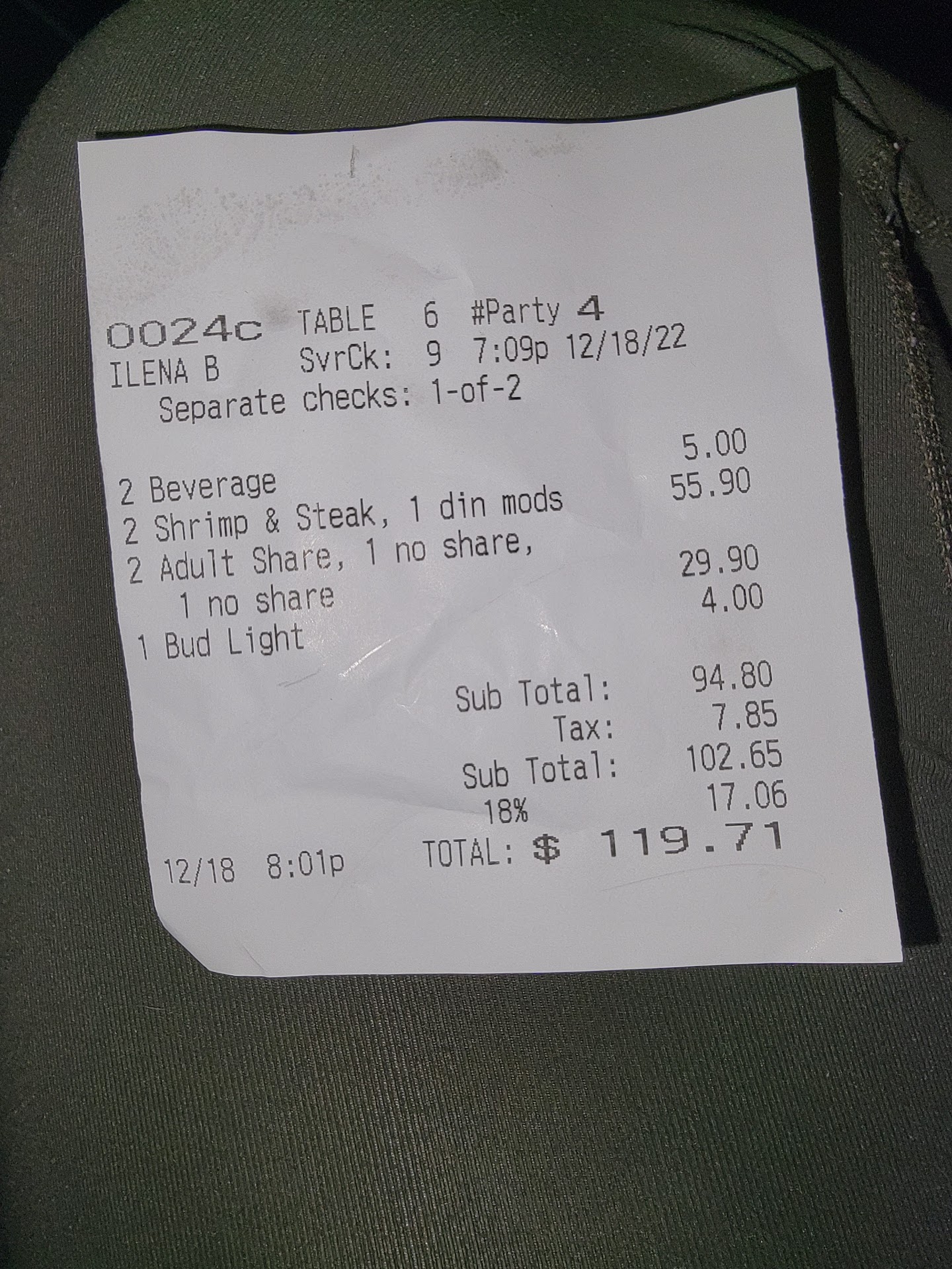 Edited (and in response to the owner below): No, I have no interest in contacting you so you can further argue with me and berate me for telling the truth about our experience. A professional response would have been an apology, an offer to make things right, and a list of things you are doing to improve! You clearly have no idea how to run a business, and instead would just like to keep arguing with reviews in a desperate attempt to still draw in customers somehow? The restaurant was disgusting, and the bathrooms smelled and looked like they hadn't been cleaned in 10 years. You could smell them all the way out in the lobby where we sat until 8:27 for our 8pm reservation. There are many similar reviews repeatedly saying the same thing about how dirty the grills and floors are. This has nothing to do w covid! On the steak, again, your response makes it even worse! How about telling your customers before hand? How about being transparent and upfront w PRICING and not surprising them with upcharges galore because you can't properly manage your inventory and supplies? It's not our fault you ran out of your most popular entree, so why should we have to pay extra for your incompetence? Lord knows that there is enough markup in your normal prices to cover it. All your responses are doing today is reinforcing why nobody should come to your...