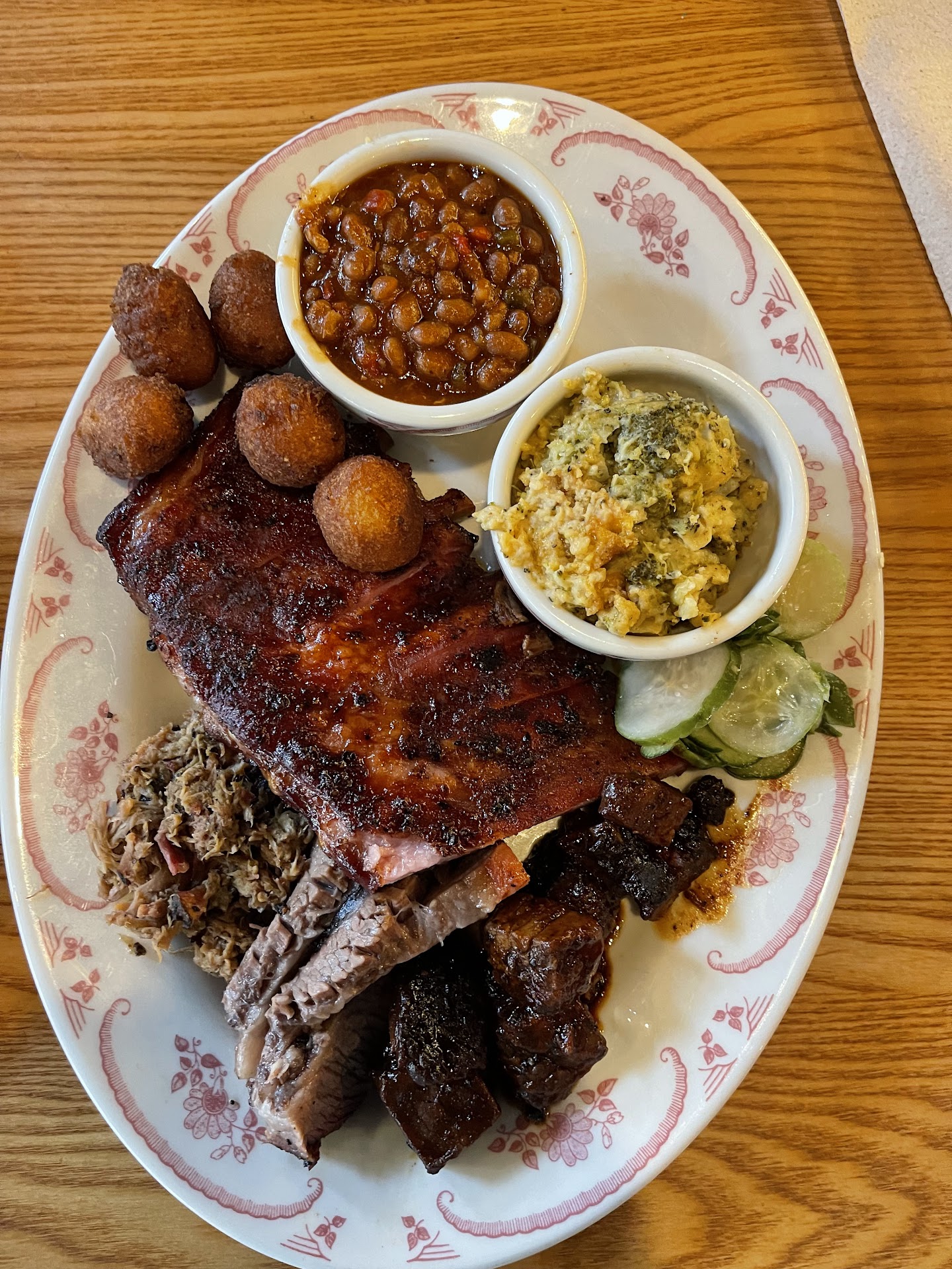 Off the top, she was very welcoming, smiling and very happy. Once we were seated she got our drink orders for us. We told her this was our first visit. She explained about the specials of the day, about the restaurants other offerings and the restaurant in general. We followed her recommendation and got the 4 meat sampler. We had pork bbq, beef brisket, burnt ends and a half rack of ribs. Our sides were bbq beans and broccoli casserole. The plate also came with hush puppies and pickles. There was plenty off food for my wife and I and this was also a cheaper option for us and allowed us to sample several menu items. The food came out quick, hot and fresh.