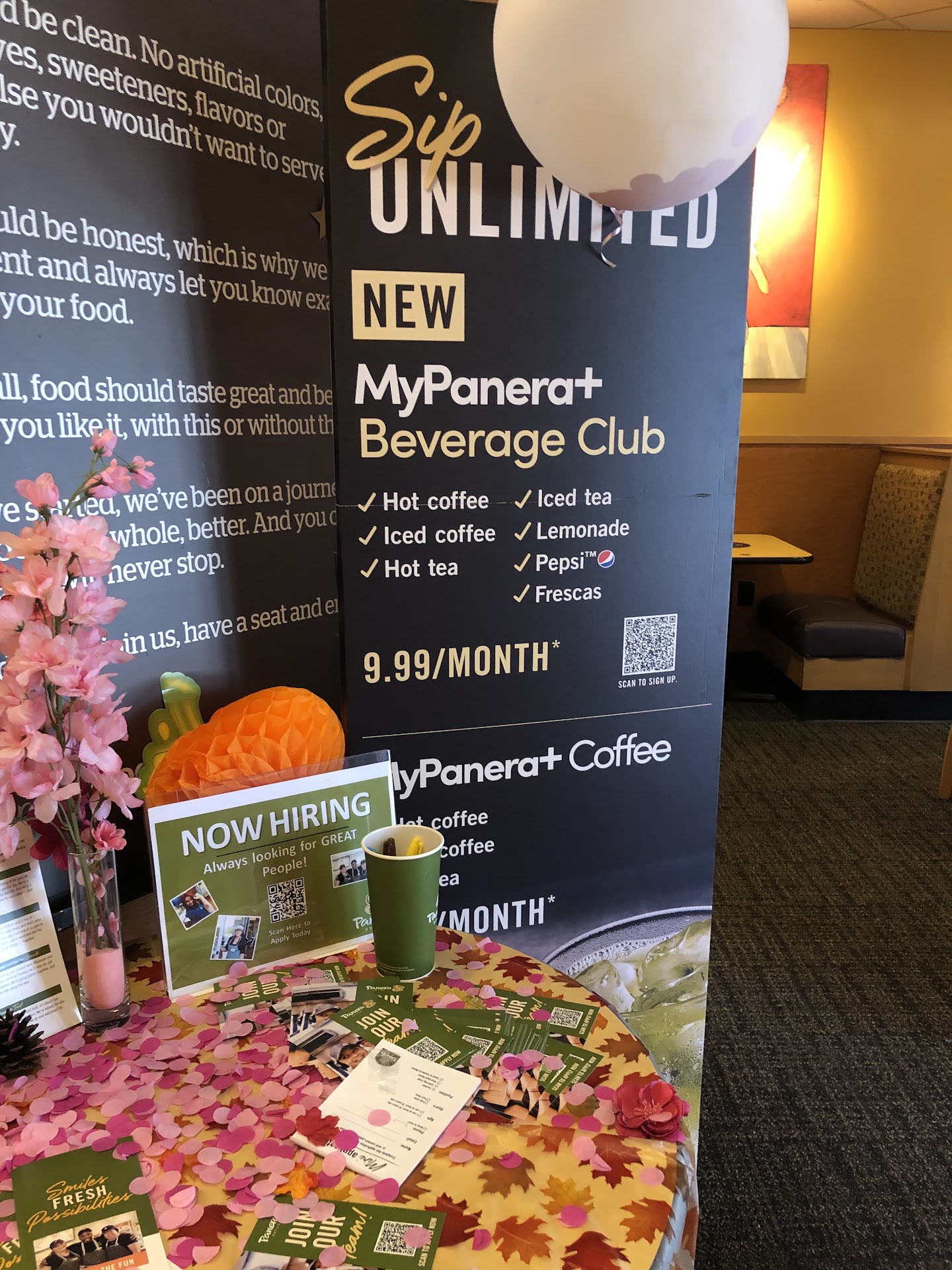 Read moreVisited this location tonight and was highly disappointed with the service and establishment. We have visited this particular Panera many times over the last few years however, our last few trips have been nothing but disappointment. Tonight, my mother and I walked in for dinner and waited about three minutes before a cashier decided to come out of the back and help us, I would also like to say the only reason the cashier came out of the back was because I started yelling “EXCUSE ME, EXCUSE ME” so we could place our order. Had I not done this, I probably would have stood there for an additional five minutes before anyone noticed us and the customers behind us. I looked over at the baked goods and there were flies all over them. Once we finally got our order placed, we went to go look for a table, the floor was filthy with food, straw wrappers, and trash from the day. Not one single table was clean we had to wipe down our own table with wipes that we luckily had on hand. I went to go get drinks, and to my surprise there was a pool of different liquid’s at the drink station on the counter with lids floating in them. By the time we got our food we were completely disgusted with the restaurant. We quickly tried to eat our food, and the food was horrible. We didn’t even end up finishing it and not for nothing for the mediocre food that you are given it’s not cheap. We will never visit this or another Panera Bread again, the lack of accountability to keep the restaurant clean...