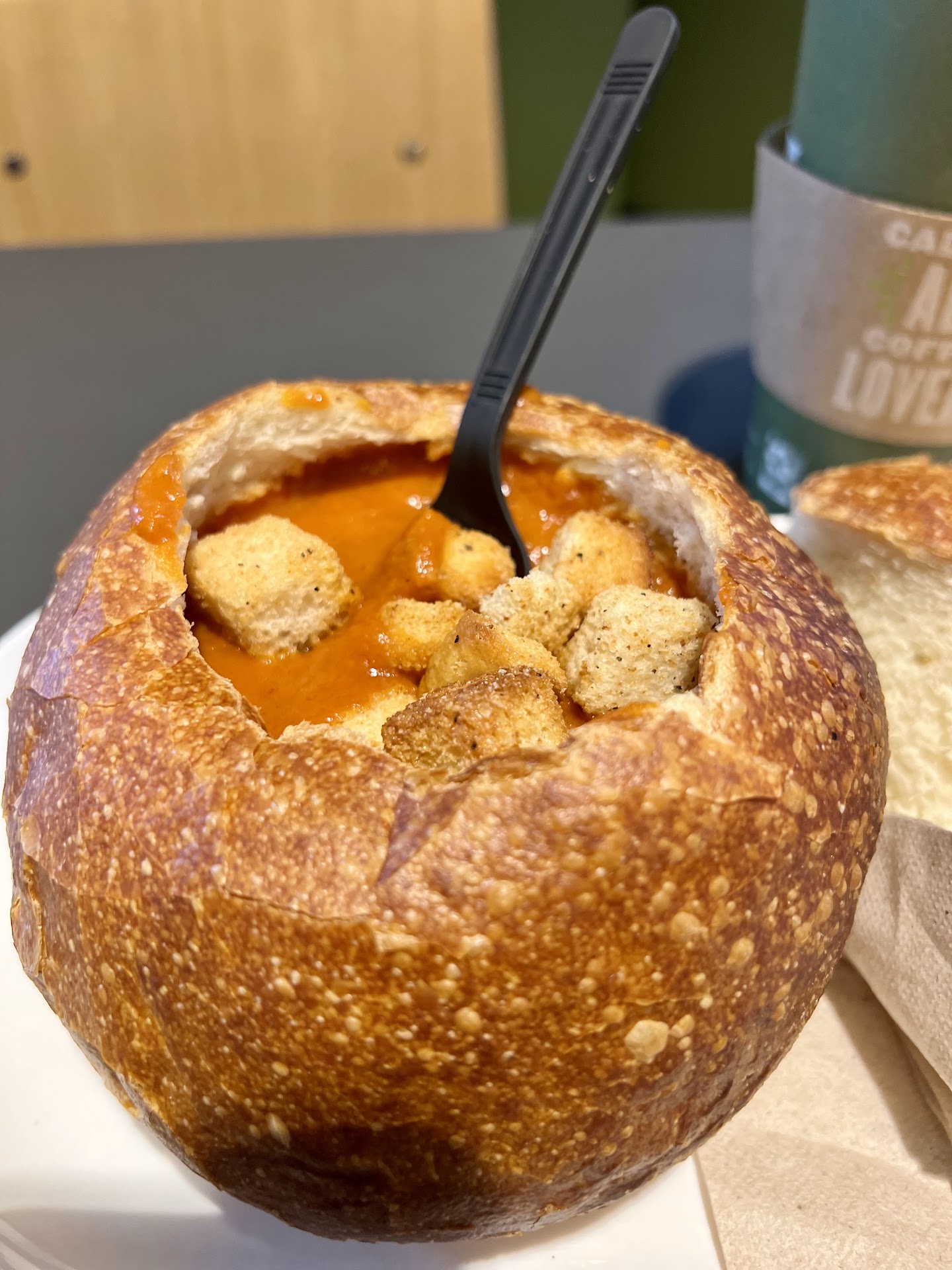 I walk back up to the counter. Explain that this has never been and issues before, and the soup itself is actually cold. One girl explains that they do not have a strainer, while another girl at the same time says it's the best we can do with a very sarcastic grin. I simply ask them to at the very least heat it up.