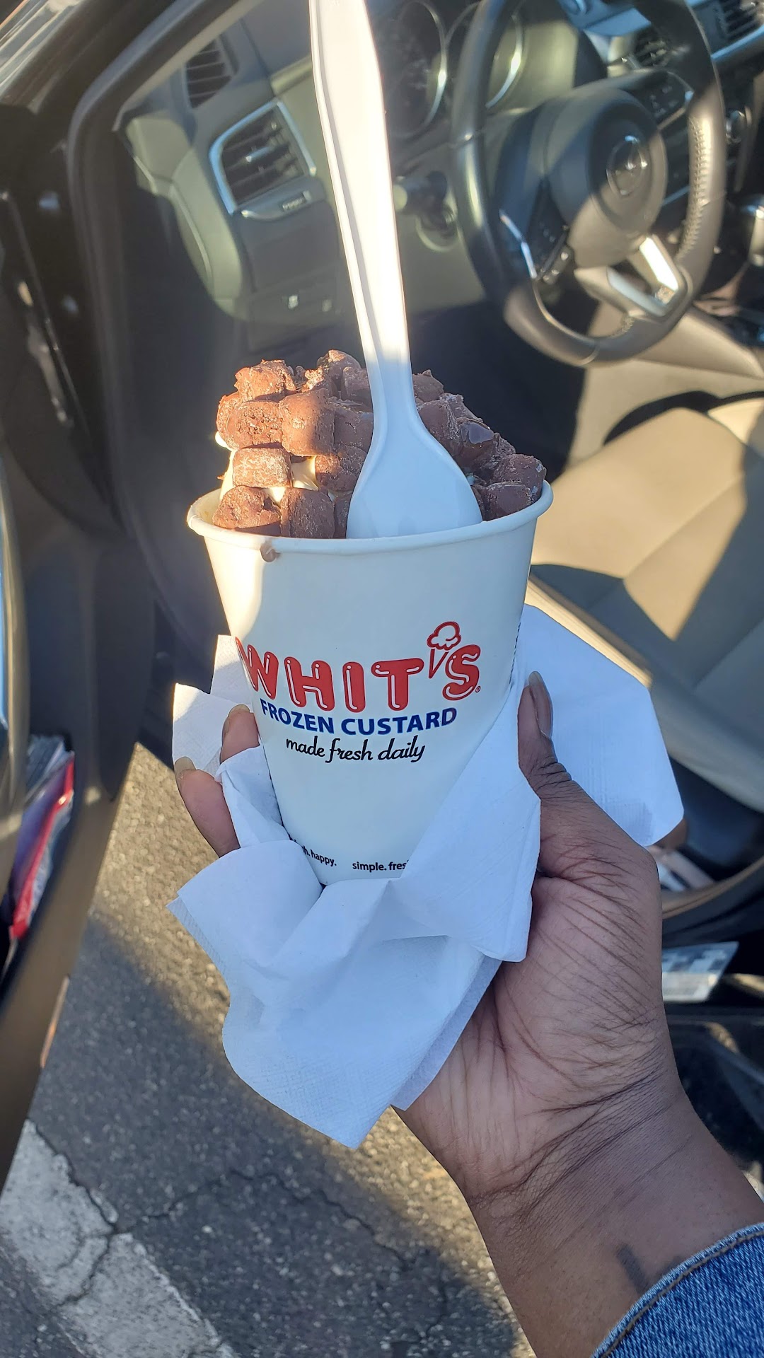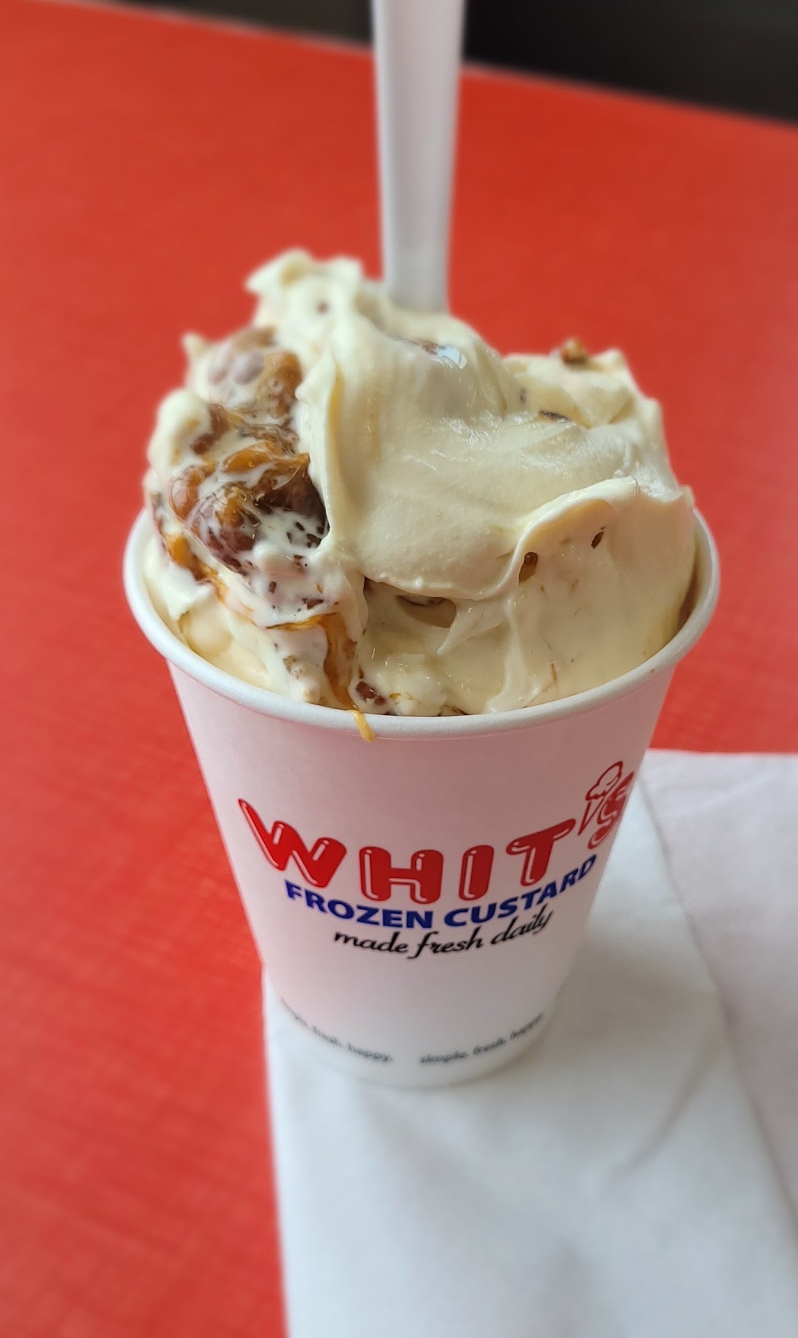 The custard I ordered came in a cup with a large plastic dome on the top. It was a hot day and with COVID we ate outside. The issue we all had was that tops didn't connect to the cup properly. Everything was leaking out and it really was a mess.