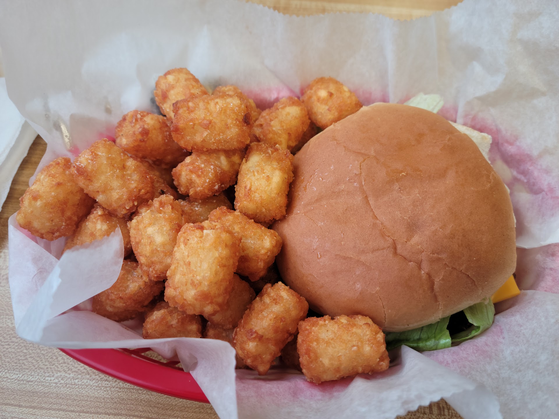 Now, the not so good. We ordered a pizza burger and a cheeseburger. The patties were like the cheap frozen hamburgers that Walmart has, that are not 100% pure beef. The patties taste not so good. I was extremely shocked that they served lettuce which was turning black and some areas was slimy.