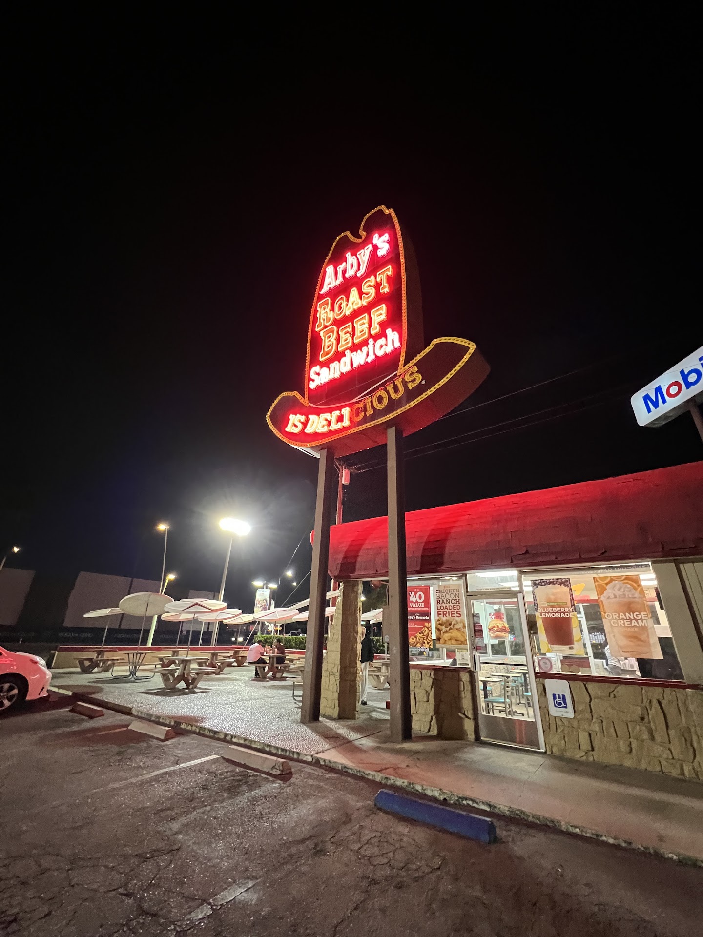 Read moreOldie but Goodie! 3 hours into our 4 hour drive home, my 11 yo desperately needed a bathroom break, so we stopped at the first place we recognized off the I-405 Beach Blvd exit - an ancient Arby's! We were greeted by a very friendly manager (with the bathroom key in his hand!) who told us this was an early version of Arby's from the 60's. It's definitely showing its age, but it was clean (including the smallish outdoor bathroom) and food was great. My son had the Smokehouse Brisket, which he said was excellent - and he knows his BBQ! I had the Classic Roast Beef, which the manager pointed out was part of a BOGO offer and a second one only costs $0.11 more - what a deal! Opted for the mozzarella sticks instead, which were piping hot and came with a tasty marinara sauce. Overall, an enjoyable experience and would definitely...
