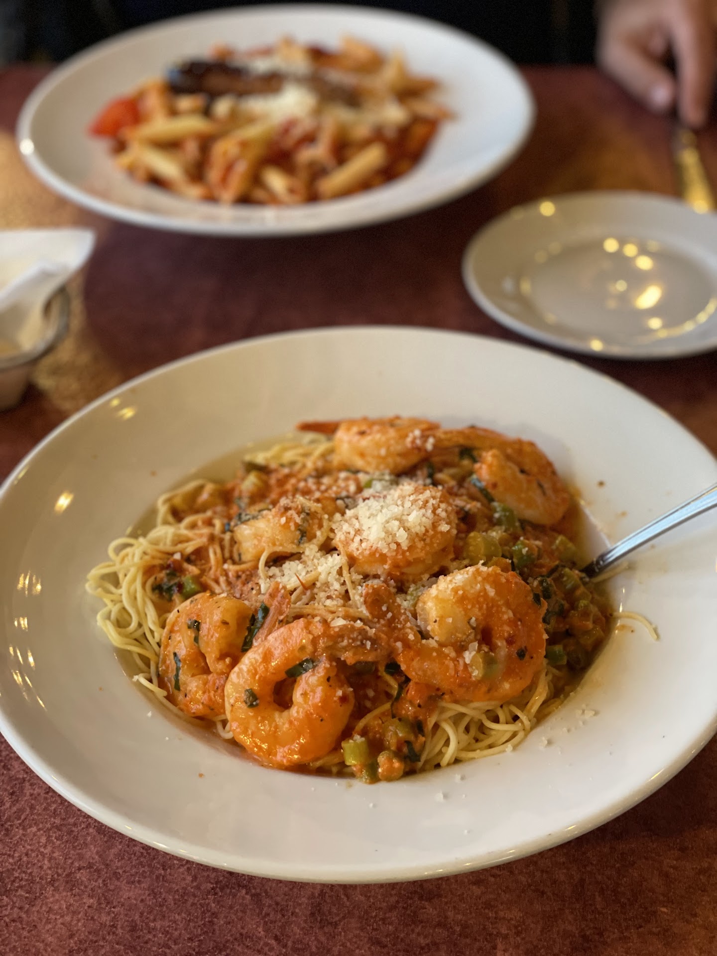 In fact, the food is quite good. Not spectacular, but good. And prices are reasonable, meaning that the bang for your buck is pretty high. I had the "pastora" (shepherd-style) penne, which is pasta with tomato sauce, ricotta, mushrooms, sausages, and a ton of cheese on top. Authentic? Not really, but definitely creative. It's like a baked "boscaiola" (pasta with cream sauce, mushrooms, and sausages) with a tomato sauce in place of the cream. It was very tasty, and I enjoyed it, despite having a tad too much tomato sauce and cheese (like I said, Italian-American style). My wife had the "melanzane alla parmigiana" (eggplant parmesan), which I also sampled. They came with a side of spaghetti with meat sauce (once again, a traditional Italian-American way to serve this dish). Also quite tasty, and I particularly liked the meat sauce (for the record, you can also order this dish with marinara sauce, if you prefer).
