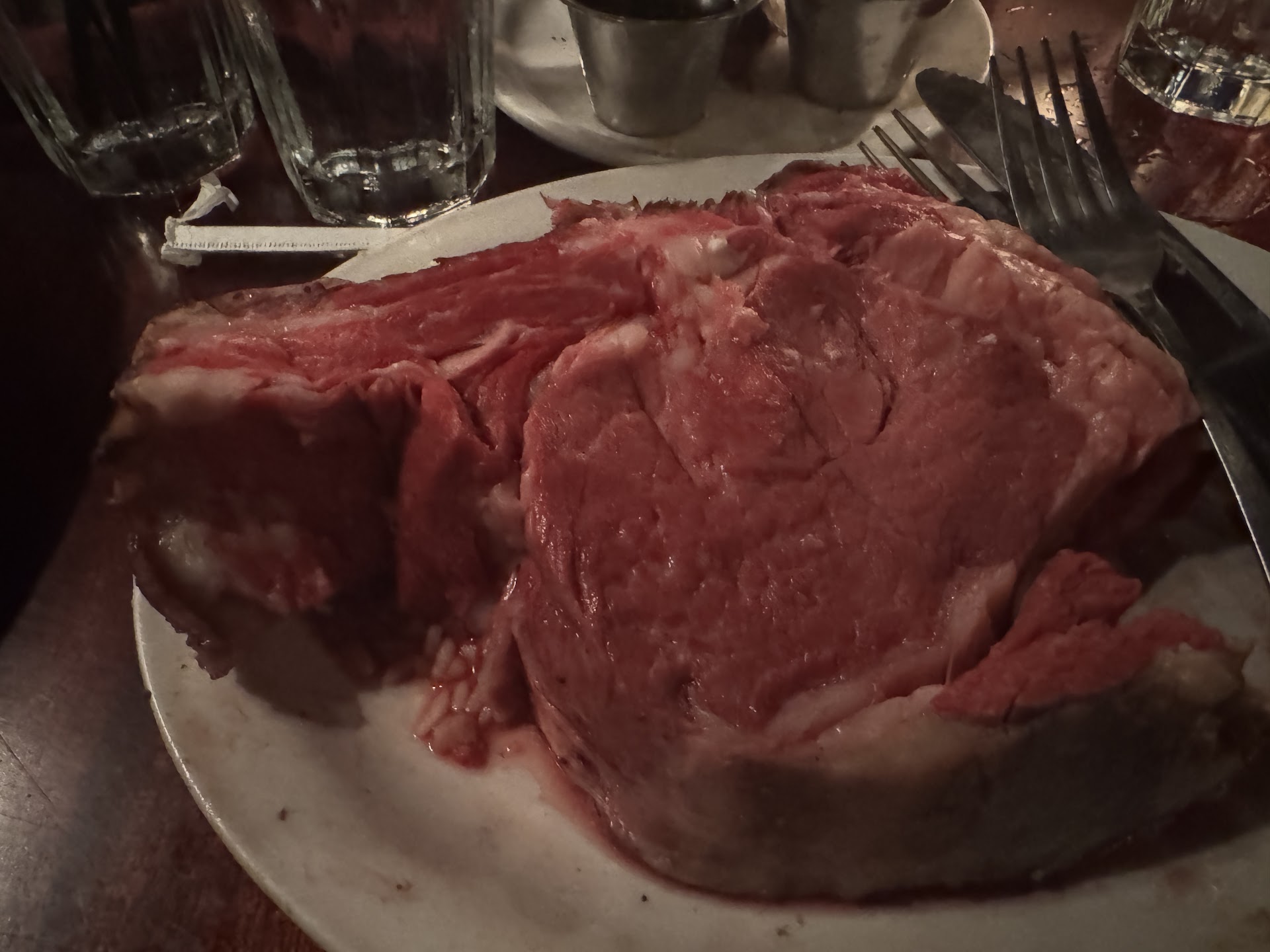 Prime rib: an enormous slice of meat that has sat in the fridge just a few hours too long. It was cooked correctly, but it was totally unseasoned. It had never even seen a container of salt. I'd prefer a smaller steak cooked by someone who knows what they're doing.
