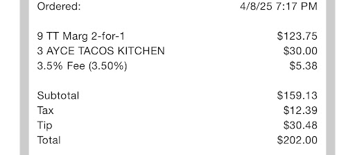Only thing is they donât really follow the happy hour specials that are on their menu online. For example: site says half off margaritas but instead itâs a double for the price of a single (~$13, even though a normal double is 21.75 meaning half off should be 10.88). Also, tacos are supposed to be half off, right (13.75 / 2 = 6.88)? No - itâs $10 AYCE which I wasnât aware of.